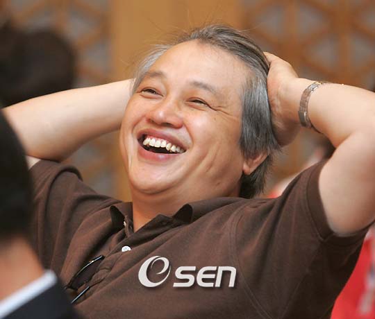본격 인터넷/모바일 영화를 표방하는 굿 럭(Good Luck)과 킹 시터(Kingsitter)의 시사회가 29일 신라호텔에서 열렸다. 인터넷과 모바일 전용으로 편당 상영 시간 10분짜리 10편으로 이루어져 있다. 굿럭의 감독을 맡은 이규형 감독이 사회자가 도박이라는 말을 쓰자 '도박이 아니라 게임'이라며 웃고 있다. /손용호 기자spjj@osen.co.kr