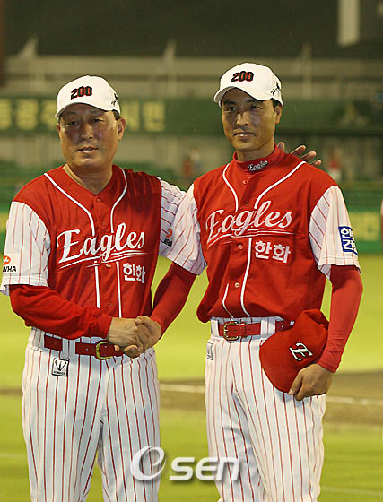 "장하다". 김인식(59) 한화 감독은 송진우가 200승을 달성하자 '200'이라는 숫자가 새겨진 흰색 모자를 쓴 뒤 송진우의 손을 잡고 등을 토닥이며 축하해주었다. 그동안 몇 차례 200승 도전에 실패해 부담스러웠던 송진우도 활짝 웃으며 정중히 인사를 했다. 김인식 감독은 취재진으로부터 축하 멘트를 요청받자 "한마디로 장하다. 23년 전(83년 동국대 감독 시절) 괴산(송진우의 고향은 증평) 장날에 스카우트하려고 찾아갔는데 아버님이 안계셔서 기다렸던 기억이 엊그제 같은데 200승을 달성하다니 장하다"고 말했다. 또 "다른 선수들도 있지만 본인이 체력 관리를 잘했기 때문에 부상당하지 않고 여기까지 왔다. 이제는 3000이닝을 꼭 달성했으면 좋겠다"며 3000이닝 달성을 기원하기도 했다. 김 감독은 그동안 4차례 200승 도전에 실패한 것에 대해서는 "실패했을 때 본인도 부담스러워했고 팀도 빨리 달성하기를 바랬다. 송진우의 200승 때문에 투수 로테이션 조정이 힘들었다"며 나름대로의 고충을 말하며 후련한 표정을 지었다. sunnY@osen.co.kr 광주=김영민 기자ajyoung@osen.co.kr