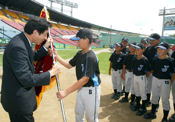 제20회 두산 베어스기 어린이야구대회가 중대 초등학교와 안산시 리틀팀이 우승기를 차지한 가운데 30일 잠실야구장에서 폐막됐다. 지난 22일 개막한 이번 대회에는 초등부 28개팀과 리틀부 14개팀이 각각 잠실 및 목동야구장과 장충 어린이야구장에서 열전을 펼쳐 30일 초등부 결승전을 끝으로 9일간의 일정을 마무리했다. 초등부 결승전 직후 거행된 폐회식에는 두산베어스의 김승영 단장과 공동 주최자인 서울시 야구협회, 한국리틀야구 연맹, 소년한국일보의 임원들이 참석, 어린 야구 꿈나무들의 선전을 격려하며 시상식을 가졌다. 두산 베어스는 초등부와 리틀팀의 우승팀 및 입상팀(준우승,공동 3위)에게 상장과 크리스털 트로피, 기념메달, 그리고 부상으로 휠라(FILA) 상품권, 스카이라인 공, 포수미트를 포함한 포수장비 세트, X BOX 360 게임기 등을 각각 전달했다. 또 대회 기간 동안 남다른 투지와 좋은 매너를 보인 팀에게 수여되는 ‘두산베어스상’은 인헌 초등학교가 차지, 3위 이상 입상팀들과 함께 트로피와 경기구, 포수장비 세트 등을 전달받았다. 한편 두산베어스는 참가한 42개팀 모두에게 스카이라인 공 5타와 알루미늄 배트 2자루 등을 참가기념품으로 지급했다. 중대초등학교의 주장 장운호가 두산 김승영 단장으로부터 우승기를 받고 있다./두산 베어스 제공
