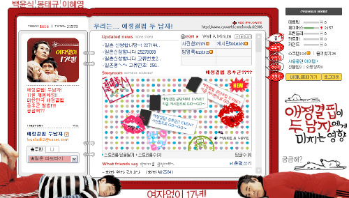 백윤식 봉태규 주연의 영화 ‘애정결핍이 두 남자에게 미치는 영향’(이하 ‘애정결핍 두 남자’)이 인터넷사이트 싸이월드에 미니홈피를 오픈했다. ‘애정결핍 두 남자’ 미니홈피는 귀차니즘 증세를 몸소 실천하듯 방바닥에 엎드려 꿈틀거리는 백윤식과 봉태규의 모습을 담은 스킨이 먼저 눈에 들어온다. 서로 엇박자로 꿈틀대는 두 사람의 모습은 귀여우면서도 엽기적이어서 애정결핍이 이들에게 미치는 영향이 무엇인지 궁금증을 갖게 한다. 뻔뻔하고 능글맞은 동철동(백윤식 분)의 애정결핍 증상과 천진하면서도 난폭한 동현(봉태규 분)의 모습도 미니홈피를 통해 볼 수 있다. 현재 80%의 촬영을 마친 ‘애정결핍 두 남자’는 올 11월에 개봉할 예정이다. pharos@osen.co.kr