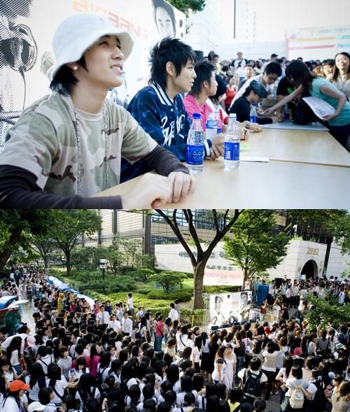 YG 엔터테인먼트의 공식 홈페이지가 9월 1일 오후 8시 이후부터 다운돼 접속이 불가능하다. 원인은 다음날 열린 빅뱅의 팬 사인회 때문. 빅뱅은 2일 서울 광화문 교보문고에서 진행된 팬 사인회를 위해 전날 관련 공지문을 홈페이지에 게재했다. 이 사실을 안 빅뱅의 팬들이 홈페이지로 몰리는 바람에 서버가 다운됐고 이에 만 하루가 지난 지금까지도 복구가 안 되고 있는 상황이다. 한편, 빅뱅은 팬 사인회에서 몰려든 2000여명의 팬들을 보고 놀라움을 금치 못했다. 8월 29일 첫 번째 싱글을 발표하고 이제 막 시작하는 신인그룹이라 이토록 많은 팬들이 몰릴 줄 미처 예상하지 못했기 때문이다. 빅뱅은 돌아가면서 일일이 팬들과 악수를 나누고 준비된 사인지를 건넸다. YG 엔터테인먼트의 한 관계자는 “팬 사인회를 위해 마련한 번호표 2000장이 다 동이 났기 때문에 적어도 2000명 이상은 모인 것 같다”며 “빅뱅도 예상치 못했던 일이었기 때문에 놀라면서도 많이 좋아하는 것 같다”고 전했다. 또 이 관계자는 “15일 있을 빅뱅의 쇼케이스 티켓도 발매를 시작한 지 2분 만에 2000장이 모두 매진됐다”며 “우리로서도 놀라울 따름이다”고 덧붙였다. 이날 오후 5시부터 한 시간 가량 진행된 빅뱅의 팬 사인회에는 2000여명 이상의 팬들이 운집했고 이들의 안전사고를 대비해 사설경호원 30명이 동원됐다. 이들 중 1명이 갑자기 몰려든 팬들에 떠밀려 발을 밟히는 부상을 당했으며 티셔츠와 사인 CD 판매는 예상 밖의 인파에 진행되지 못했다. orialdo@osen.co.kr YG 엔터테인먼트 제공.