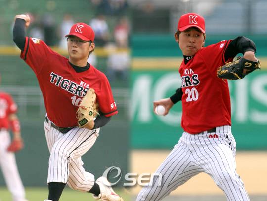 "삼성 부럽지 않다". 삼성 특유의 '권오준-오승환 필승 방정식'이 KIA에도 가동되고 있다. 10억 루키 한기주(19)와 겁없는 소방수 윤석민(20)이 필승을 책임지고 있다. 150km짜리 강속구를 뿌리며 승리를 이끈다. 이들이 아니었으면 KIA는 4위에서 밀려날 뻔했다. 최근 KIA는 두 번의 인상적인 역전승을 거뒀다. 먼저 지난 2일 문학경기에서 2-3으로 패색이 짙은 8회초 2사후 연속 2루타로 두 점을 뽑아 4위 탈락 직전에서 탈출했다. 패했다면 SK에게 4위를 내줘야 했다. 역전의 원동력은 한기주였다. 한기주는 5회2사 1,2루에서 등판해 3이닝동안 2안타 1실점으로 잘 막아주었다. 중반 대결에서 한 점으로 버텨낸 게 승인이 됐다. 윤석민은 8회 2사후 등판, 1⅓이닝을 퍼펙트로 막아 승리를 지켰다. 지난 8월 27일 현대전도 마찬가지. KIA 킬러 전준호에 막혀 5회까지 0-2로 끌려가던 KIA는 6회말 3점을 뽑아 역전에 성공했다. 당시도 한기주는 6회초 1사 후 그레이싱어를 구원, 3⅓이닝을 무안타 무실점의 환상적인 피칭으로 역전승의 발판을 놓았다. 윤석민은 9회 2사후 등판, 한 타자를 가볍게 요리하고 세이브를 챙겼다. 한기주는 오히려 미들맨이 편하다 할 정도로 위력적인 구위를 보이고 있다. 150km가 넘는 볼을 던지고 컨트롤도 좋아져 2~3이닝 정도는 상대를 완벽하게 제압할 수 있다는 평가이다. 벌써 8승을 올렸고 10승까지 넘볼 수 있다. 윤석민은 지난해 마무리 경험을 했고 컨트롤 불안도 사라졌다. 한기주와 함께 150km대의 강속구를 뿌리며 타자들을 솎아내고 있다. 시즌 중 마무리 보직을 받아 14세이브를 챙기고 있다. 고졸 2년차 답지 않은 강한 자신감으로 타자들과의 기싸움에서도 밀리지 않고 있다. 이들은 삼성의 권오준과 오승환조, 시즌 초반 한화의 최영필-구대성조과 동일한 임무를 수행하고 있다. 선발진이 무너진 가운데 앞으로도 한기주-윤석민조는 투입이 잦아질 것으로 보안다. 지금 KIA의 운명은 19살과 20살짜리 투수들의 어깨에 달려있다. sunny@osen.co.kr 한기주-윤석민.