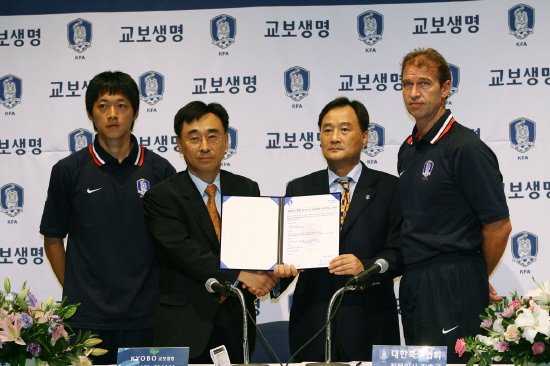 대한축구협회가 ㈜교보생명과 공식후원사 재계약을 체결했다. 협회는 4일 파주NFC(국가대표팀트레이닝센터) 대강당에서 교보생명과 공식후원사 조인식을 갖고 4년 간 계약을 맺었던 계약을 오는 2010년까지 4년 더 연장계약하기로 했다. 후원금은 4년 간 32억 원으로 교보생명은 계약기간동안 A보드 사용권 및 축구대표팀 명칭사용권 등을 획득했고 앞으로 협회와 축구 꿈나무 사업을 독점적으로 추진하게 된다. 이 자리에는 협회의 김호곤 전무이사와 교보생명의 황성식 부사장, 축구대표팀의 핌 베어벡 감독과 주장 김남일이 참석했다. iam905@osen.co.kr 대한축구협회 제공.