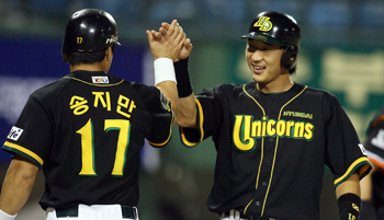 현대의 집중력이 돋보였다. 현대는 상대 구원투수의 갑작스런 컨트롤 난조와 주전 포수의 공백을 집요하게 파고든 끝에 짜릿한 재역전극을 연출해냈다. 현대가 7일 잠실구장에서 열린 2006 삼성 PAVV 프로야구 두산과의 경기서 7회 타자일순하며 대거 5점을 뽑는 집중력을 과시하며 6-3으로 역전승을 거뒀다. 최근 3연승으로 이날 KIA에 패한 선두 삼성을 3.5게임차로 추격했다. 3회 홍원기의 솔로 홈런으로 선취점을 뽑았으나 돌아선 수비서 3실점, 1-3으로 역전을 허용한 현대는 7회 찾아온 기회를 놓치지 않았다. 두산 선발 김명제와 구원 박명환의 호투에 눌려있던 현대는 7회 1사후 박명환이 갑작스럽게 컨트롤 난조에 빠진 틈을 파고들었다. 박명환은 1사후 강귀태와 대타 강병식에게 볼8개만을 던져 연속 볼넷으로 내보내며 화를 자초했다. 1사 1, 2루의 기회를 잡은 현대는 대주자 정수성과 차화준을 내세운 후 다음타자 송지만 타석때 과감히 더블 스틸을 시도해 성공을 거뒀다. 두산 포수가 주전 홍성흔이 아닌 김진수인 점을 감안한 도루 시도가 적중한 것이다. 홍성흔은 몸살 기운으로 4회 몸에 맞는 볼로 출루한 후 대주자 전상렬로 교체됐다. 송지만은 원바운드볼까지 커트해내며 박명환을 물고 늘어진끝에 깨끗한 좌전 적시타를 터트려 3루주자 정성훈을 홈으로 불러들였다. 계속된 1사 1, 3루에서는 다음타자 전준호가 투수앞 스퀴즈 번트 성공시켜 한 점을 보태며 동점을 만들었다. 기세가 오른 현대는 다음타자 이택근이 볼넷으로 출루, 2사 1, 2루의 찬스를 이어갔고 후속 서튼은 좌중간을 완전히 가르는 2타점 적시 2루타를 날려 주자를 모두 불러들였다. 여세를 몰아 이숭용도 우중간 적시 2루타를 추가해 한 점을 보탰다. 선발 손승락을 4회부터 구원등판한 우완 황두성은 3이닝 무실점으로 두산 공격을 막고 승리 투수가 됐다. 황두성은 이틀 연속 구원승으로 시즌 4승째를 올리며 최근 페이스가 살아났음을 보여줬다. 황두성은 경기 후 “우연하게 행운이 찾아오고 있다. 지난해 좋은 성적을 내고 올 시즌 더 좋은 성적을 내려는 욕심이 앞섰다. 그것이 가장 큰 부진 원인이었다. 최근 욕심을 버리니 밸런스가 잡히고 직구뿐만 아니라 체인지업이 효과적으로 구사되고 있다. 선발과 마무리를 이어주는 중간투수로서 올 시즌을 잘 마무리하겠다"고 말했다. 9회 두산의 맹추격을 뿌리치고 짜릿한 한 점 차 승리를 거둔 김재박 감독은 "오늘은 공수 모두가 훌륭하게 경기를 치렀다. 모든 선수들을 칭찬해주고 싶다"며 기뻐했다. 두산은 3회 손시헌의 적시 3루타 등으로 3점을 뽑으며 초반 기선을 잡은 데 이어 3-6으로 뒤진 9회 마지막 공격서 김동주의 적시타 등으로 2점을 추가하며 막판 동점 찬스를 잡았으나 현대 내야진의 호수비에 막혀 분루를 삼켜야 했다. 두산 선발 김명제는 5이닝 3피안타 1실점으로 호투, 올 10연패의 사슬을 끊고 시즌 첫 승을 올릴 찬스를 잡았으나 구원 박명환의 난조로 아깝게 놓쳤다. 박명환은 1⅔이닝 5실점으로 시즌 7패째를 기록했다. 두산 김경문 감독은 "투수들은 잘 던졌다. 명제의 승리를 못지켜줘 아쉽다"며 이날 패배를 아까워했다.