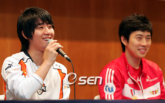 오는 10월 3일 서울 삼성동 코엑스 대서양홀 에서 열리는 제1회 슈퍼파이트 e스포츠 기자회견이 12일 서울 신라호텔 영빈관 에메랄드룸 에서 열렸다. 군입대에 얼마 남지 않은 임요환이 홍진호도 군대갈 나이가 되었다며 이번 경기에 이겨서 함께 가겠다고 말하자 홍진호가 군대는 혼자서 잘 다녀 오라며 이야기 하고 있다./주지영 기자 jj0jj0@osen.co.kr