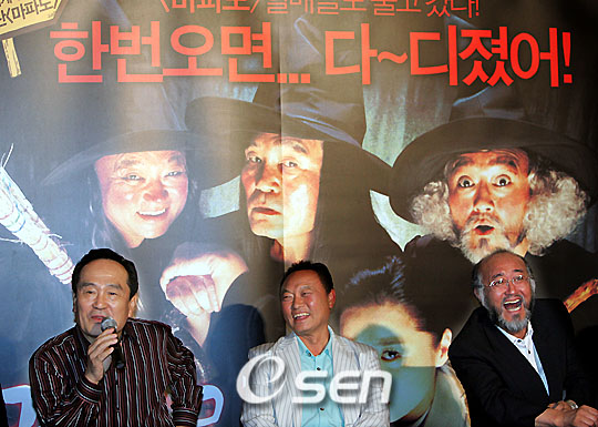 저예산 상업영화를 표방한 '무도리'의 시사회 및 기자 간담회가 14일 용산 CGV에서 박인환 최주봉 서희승 등 중견 연기자들과 서영희가 참석한 가운데 열렸다. 한 기자가 '영화를 찍으며 삶의 의미를 느낄때가 언제 있었냐'는 질문에 박인환씨가 '어려운 얘기는 좋아하지 않는다'고 얘기하자 옆에 있던 최주봉 서희승이 웃고 있다. 그러나 박인환 씨는 바로 '경솔했다며 촬영을 마치고 분장을 지울때가 가장 행복하다'고 마무리를 지었다. /손용호 기자spjj@osen.co.kr