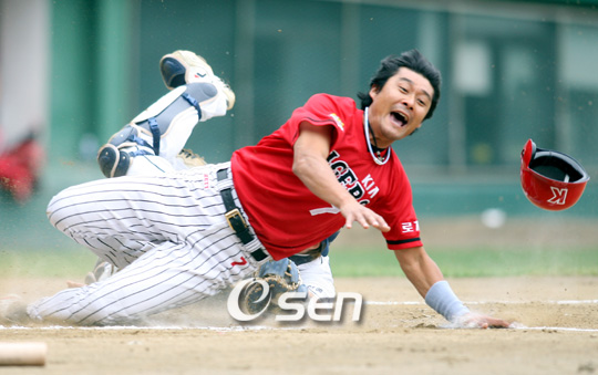 2006프로야구 4강 티켓 확보에 결정적 영향을 미칠 수 있는 두산 베어스와 KIA 타이거즈의 주말 3연전의 두번째 경기이자 17일 더블헤더 1차전이 잠실야구장에서 열렸다. KIA 2회초 1사 3루서 8번 김상훈의 스퀴즈번트 실패 때 이미 스타트를 끊은 3루주자 이종범이 홈까지 뛰어들다 태그아웃되고 있다./잠실=박영태 기자 ds3fan@osen.co.kr