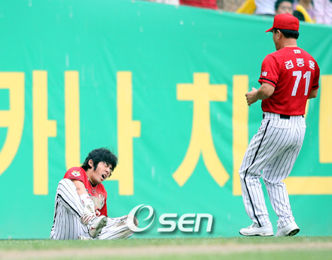2006프로야구 4강 티켓 확보에 결정적 영향을 미칠 수 있는 두산 베어스와 KIA 타이거즈의 주말 3연전의 두번째 경기이자 17일 더블헤더 1차전이 잠실야구장에서 열렸다. KIA 5회초 1사 1,2루 4번 이재주 타석 때 더블스틸에 성공한 2루주자 이용규가 3루에서 세이프된 뒤 발목을 접질려 고통스러워 하고 있다./잠실=박영태 기자 ds3fan@osen.co.kr