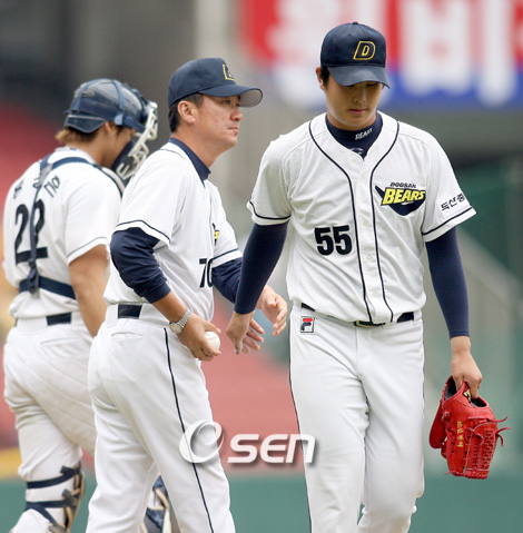 2006프로야구 4강 티켓 확보에 결정적 영향을 미칠 수 있는 두산 베어스와 KIA 타이거즈의 주말 3연전의 두번째 경기이자 17일 더블헤더 1차전이 잠실야구장에서 열렸다. KIA가 3-0으로 앞서 있던 6회초 1사 1루 1번 이용규 타석 때 두산 선발투수 김명제가 윤석환 투수코치에게 공을 넘기고 마운드를 내려오고 있다. 김명제는 올 시즌 아직 승리가 없이 10패만을 기록 중이다./잠실=박영태 기자 ds3fan@osen.co.kr