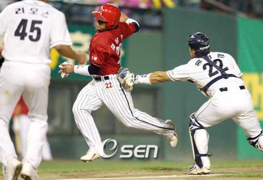 2006프로야구 4강 티켓 확보에 결정적 영향을 미칠 수 있는 두산 베어스와 KIA 타이거즈의 주말 3연전의 마지막 경기이자 17일 더블헤더 2차전이 잠실야구장에서 열렸다. KIA의 7회초 1사 1,3루 1번 이용규의 1루 땅볼 때 3루주자 김상훈이 스타트를 끊은 뒤 런다운에 걸려 포수 홍성흔에게 태그아웃되고 있다./잠실=박영태 기자 ds3fan@osen.co.kr