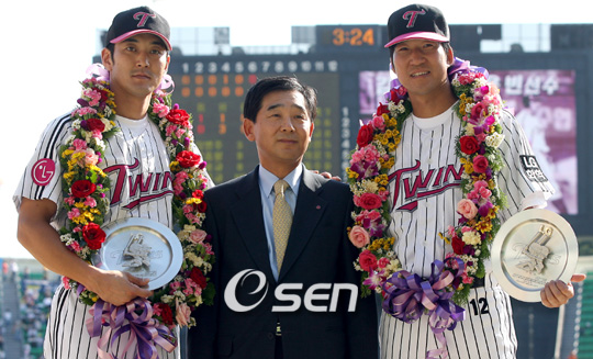 1990년대 LG 트윈스 '황금 시대'이 주역이었던 서용빈(35)과 김정민(36)이 24일 마지막 현역 경기를 치렀다. 서용빈과 김정민은 LG의 시즌 마지막 홈경기였던 잠실 두산전에 7번타자 겸 1루수로, 8번타자 겸 포수로 선발 출장했다. 이미 LG 구단은 5이닝을 마치면 두 선수의 은퇴식을 거행하기로 계획한 상태였다. 서용빈의 절친한 친구인 안재욱이 시구를 했고 탤런트인 부인 유혜정 씨 등 가족들이 그의 마지막 경기를 지켜봤다. 김정민의 가족들 역시 야구장을 찾았다. 프로 입단 이래 오직 LG 한 팀에서만 뛰다 유니폼을 벗게 된 두 선수는 '수비에선 일급'이라는 예전의 평가대로 큰 흠 없이 마지막 무대를 치렀다. 특히 김정민은 5회 2사 1루에서 고영욱의 2루 도루를 잡아내 자신의 마지막 아웃카운트를 자기 어깨로 만들어냈다. 또한 LG 선발 정재복을 5이닝 1실점으로 효과적으로 리드해줬다. 서용빈은 공격에서 두산 좌완 이혜천을 상대로 3회와 5회 각각 유격수 땅볼로 아웃됐다. 김정민도 3회말 마지막 타석에서 유격수 땅볼 아웃됐다. 그렇지만 잠실을 찾은 두산과 LG 팬은 서용빈과 김정민의 플레이에 박수를 아끼지 않았다. 비록 마지막 경기의 마지막 타석을 화려하게 장식하지는 못했으나 24일 LG의 시즌 마지막 경기의 주인공은 누가 뭐래도 서용빈과 김정민임을 알고 있었기 때문일 것이다. sgoi@osen.co.kr 잠실=박영태 기자 ds3fan@osen.co.kr