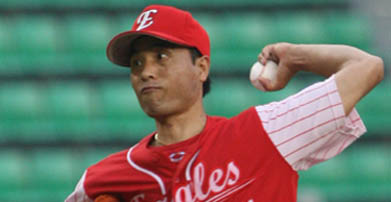 '회장님' 송진우(한화)가 롯데 에이스 손민한과의 대결에서 승리하며 개인통산 201승을 올렸다. 지난 달 29일 KIA전에서 200승을 올린 후 3전 4기 끝에 승수를 추가했다. 송진우는 24일 부산 사직구장에서 열린 롯데와 원정 경기에 선발 등판, 6이닝 7피안타 3볼넷 5탈삼진 1실점으로 호투, 팀의 8-1 승리에 기여했다. 한화의 다이나마이트 타선은 장단 18안타를 퍼부으며 송진우의 승리를 화끈하게 지원했다. 송진우는 4경기만에 승수를 추가해 시즌 8승째를 올렸다. 송진우는 직구 최고 구속은 140km에 못미쳤지만 안정된 컨트롤의 ‘관록투’로 롯데 타선을 1점으로 막았다. 송진우의 호투와 화끈한 타격으로 한화는 사직구장 5연승을 구가했다. 반면 최근 지친 기색이 역력하며 페이스가 떨어진 작년 최우수선수(MVP)인 롯데 에이스 손민한은 2이닝 2실점한 뒤 자진 강판, 패전을 기록했다. 최근 3연패. 한화는 1회 이도형의 중전 안타와 김태균의 좌중월 2루타로 만든 2사 2, 3루에서 이범호의 싹쓸이 중전 적시타로 선취점을 뽑고 2-0으로 앞섰다. 기세가 오른 한화는 3회 2루타 2개 등 안타 6개와 몸 맞는 공 1개, 희생플라이 2개를 묶어 대거 5득점하며 7-0으로 달아나며 일찌감치 승기를 잡았다. 롯데는 0-8로 뒤진 5회말 손인호의 적시타로 1점을 만회해 간신히 영봉패를 면했다. 한화는 7회부터 이어던진 중간계투 서민욱이 이어던지며 3이닝을 무안타 무실점 3탈삼진의 퍼펙트 피칭으로 롯데 타선을 잠재우고 세이브를 챙겼다. 김태균은 4타수 3안타 1타점 2득점, 이범호는 4타수 3안타 3타점 1득점으로 공격을 주도했다. 반면 타격 트리플크라운(홈런 타율 타점)을 노리고 있는 롯데 간판타자 이대호는 최근 컨디션 난조로 이날도 결장, 이틀 연속 선발 명단에서 제외됐다. 송진우.