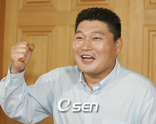 천하장사 출신으로 연예계에 입문 명 MC로 이름을 날리고 있는 강호동이 25일 SBS 일산제작센터에서 결혼 발표 기자회견을 가졌다. 신부는 9살 연하인 27살 이효진 씨로 디자인을 전공하는 대학원생이다. 강호동이 '뚱뚱한 강호동이도 장가 갑니다. 대한민국 노총각 여러분 힘 내세요'라고 얘기하며 주먹을 불끈 쥐고 있다./일산=손용호 기자spjj@osen.co.kr