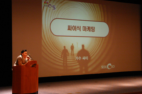 싸이가 삼성 계열사 CEO들의 자녀들을 대상으로 마케팅강의를 해 화제다. 싸이는 9월 26일 삼성 경제연구소에서 주관하는 ‘SERI CEO’ 과정에 있는 학생들을 대상으로 진행된 이번 강의에서 ‘싸이식 마케팅’이라는 제목의 특강으로 2001년 ‘새’라는 노래를 들고 엽기가수로 등장해 2006년 현재의 싸이가 된 과정과 ‘올나잇스탠드’라는 공연을 지난 3년 간 매진시킬 수 있었던 과정에 대해 직접 설명했다. 이날 강의에서 싸이는 "나의 마케팅 전략의 핵심은 주제파악"이라며 "자신의 장점을 알리는 것 보다 단점을 인정하고 보완하는 것이 뛰어난 마케팅"이라고 강조했다. 그 예로 "뛰어난 외모나 완벽한 춤, 그리고 음악성이 깊은 음악은 모두 내가 잘 할 수 없는 것들이다. 나는 쉽고 신나는 음악을 하고 사람들이 따라 하기 쉬운 춤을 춘다"며 "사람들이 따라 하기 쉽다는 것은 바꿔 말하자면 만만하다는 얘기이고 만만하다는 것은 21세기 코드인 참여문화에 부합한다’고 마무리했다. 1시간 동안 진행된 강의는 시종일관 싸이 특유의 입담으로 웃음이 끊이지 않았으며 강의가 끝난 후에도 30분 간 질의응답 시간을 갖기도 했다. 싸이는 "세상에는 자신이 하고 싶은 일과 할 수 있는 일이 있다. 당장 자신이 하고 싶은 일만을 쫓다 보면 정작 아무것도 할 수가 없다. 지금 자신이 할 수 있는 일을 하다 보면 미래의 어느 날 자신이 할 수 있는 일이 과거에 자신이 하고 싶어 했던 일이 돼 있을 것"이라는 의미심장한 말을 남기기도 했다. 싸이는 강당을 떠나며 "강의라고 하면 너무 과분한 어휘이고 그냥 경험담쯤으로 해두자. 주제파악을 해야 하기에 내일부터 다시 여러분에게 가수로 다가가겠다"고 말해 학생들의 큰 박수를 받았다. hellow0827@osen.co.kr