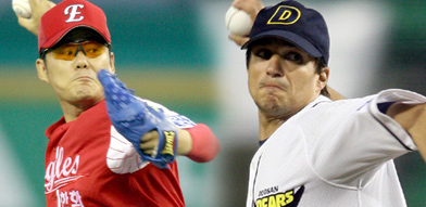 두산은 최근 '전승 모드'다. 전승을 해도 자력으로 준플레이오프에 진출할 수 없다는 절박함 때문에 매 경기 총력전을 벌이고 있다. 강한 집중력 덕분인지 최근 3연승을 거두고 있다. 9월 29일 롯데, 30일 삼성을 꺾은 데 이어 지난 1일 SK에 이겼다. 이 중 포스트시즌에 진출한 팀은 삼성뿐이고 삼성은 한국시리즈에 직행해 있어 두산 입장에서 향후 상대로서 생각할 겨를은 없었다. 하지만 2일 만날 한화는 좀 다르다. 페넌트레이스 3위를 확정짓고 준플레이오프에 진출, 상대를 고를 수도 있는 입장에 있는 팀이다. 물론 한화가 두산에 지든 이기든 이날 KIA가 롯데를 꺾으면 두산의 경기 결과에 관계 없이 KIA가 4위로 확정(최소한 동률이 되더라도 KIA가 두산과 상대 전적에서 앞섬)되지만 한화로서는 다시 주판알을 튕겨볼 필요는 있다. 이날 두산이 지면 KIA는 패해도 포스트시즌에 오르기 때문이다. 한화는 이미 올 시즌 18차례 대결을 마친 KIA를 상대로 11승 7패로 앞섰고 한 게임을 남겨둔 두산에는 9승 8패로 역시 리드, 최종전서 패하더라도 호각을 이룰 수 있으나 어쨌든 기록상으로는 두산보다 KIA전 성적이 좋았다. 이날 한화는 문동환을 선발투수로 내세우고 두산은 에이스 리오스를 기용한다. 리오스는 올 한화전서 3승 2패에 방어율 2.91로 자신의 시즌 성적(12승 15패, 방어율 2.87)과 비슷한 결과를 보였고 문동환은 1패에 방어율 3.65로 15승 9패, 방어율 3.15의 시즌 성적에 비해 나쁘다. 리오스는 승운이 덜 따라서 랜들(16승 8패)에 이어 팀 내 다승 2위에 그쳤을 뿐 랜들(2.95)보다 방어율에서도 근소하게 앞서고 무엇보다도 '에이스의 척도'라 할 수 있는 투구 이닝에서 압도적으로 많다. 랜들이 192⅓이닝을 던진 반면 리오스는 무려 232이닝을 던졌다. 랜들이 30경기, 리오스가 33경기에 등판해 3차례 더 나왔지만 40이닝 가까운 차이가 난다. 그만큼 등판할 때마다 많은 이닝을 책임졌다는 얘기다. 이에 맞설 문동환은 지난 9월 9일 현대전서 7이닝 4실점승을 거둔 뒤 3경기서 2패만 안으며 승리를 추가하지 못했다. 개인적인 목표였던 자신의 한 시즌 최다승 기록(99년 17승) 경신은 물론 타이 기록도 세울 수 없게 됐지만 포스트시즌서 어차피 중책을 맡아야 할 고참 투수로서 페넌트레이스 마지막 등판서 컨디션을 최종 점검할 필요가 있다. 문동환-리오스.