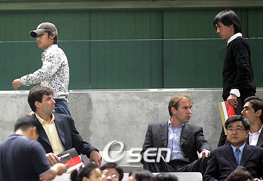 삼성하우젠 K-리그 2006 FC 서울과 울산 현대의 경기가 4일 서울 상암 월드컵경기장에서 벌어졌다. 경기 전 부상으로 경기에 출전치 못한 이천수와 귀빈석 뒤에서 얘기를 나눈 홍명보 대표팀 코치가 먼저 자리에 앉은 베어벡 감독 뒤로 걸어가고 있다. 베어벡 감독과 홍명보 코치는 귀빈석 뒤에서 이천수와 10여 분간 얘기를 나누었다./상암=손용호 기자spjj@osen.co.kr