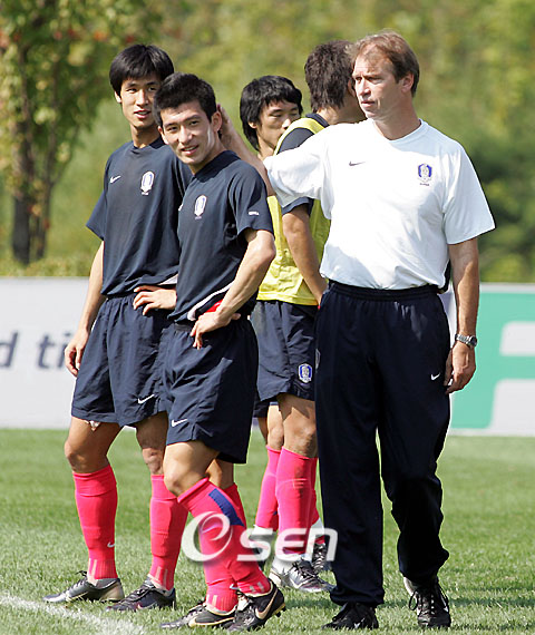 '아프리카의 강호 가나 격파는 젊은 피들에 맡긴다'. 가나 격파의 선봉은 아시안 게임에 출전할 젊은 선수들이 맡을 것으로 보인다. 지난 5일 파주 국가대표축구팀 트레이닝센터(파주 NFC)에 대표팀을 소집한 베어벡 감독은 훈련을 통해 젊은 선수들을 집중조련하는 모습을 보여주었다. 6일 실시된 전술훈련에서 백지훈(서울)과 염기훈(전북) 등 젊은 피들이 관찰한 베어벡 감독은 7일 오전 훈련에서도 젊은 선수들을 직접 지도하며 그들의 가나전 선발 출전 가능성을 높였다. 좌우 사이드에서 크로스를 올리며 공격 전술을 시험한 훈련에서도 베어벡 감독은 오장은(대구)과 백지훈 그리고 이호(제니트) 등을 중앙에 배치시며 젊은 피들에 대한 관찰에 주력했다. 또한 좌우 사이드에서도 박주성(광주)과 염기훈(전북) 등을 시험했고 센터백에는 김진규(주빌로)와 김동진(제니트)를 세우기도 했다. 여기에 홍명보 코치 역시 자신이 주관한 훈련에서 오범석(포항)과 정조국(서울) 등 아시안게임에 출전할 선수들에게 조언과 지도를 아낌없이 하며 용기를 북돋우어주는 모습이었다. 베어벡 감독과 코칭스태프가 이같이 젊은 선수들을 집중적으로 조련하고 있는 것은 앞으로 남아있는 아시안게임 일정 때문. 도하에서 벌어질 아시안게임이 2달 앞으로 다가왔지만 K리그 일정과 아시안컵 예선으로 인해 아시안게임 대표팀은 이제야 첫 발을 맞춘 상태다. 따라서 가나와 같은 강팀을 상대로 할 수 있는 실전 기회를 젊은 선수들에게 부여함으로써 부족한 시간에 훈련 효과를 극대화할 수 있다. 여기에 이영표(토튼햄)과 김남일(수원) 등 주전 멤버들의 몸상태도 100%가 아니기 때문이라는 현실적 상황도 고려한 것으로 보인다. 베어벡 감독 역시 인터뷰에서 "아시안게임에 뛰게 될 선수들을 함께 관찰할 수 있어 좋은 기회다" 라고 말한 바 있어 젊은 선수들이 가나를 상대할 가능성은 더욱 크다. 과연 지난 6월 스코틀랜드에서 벌어진 가나전에서의 1-3 패배를 젊은 선수들이 설욕할 수 있을지, 이와 더불어 아시안게임에 나갈 선수들의 기량을 실전에서 테스트할 수 있을지 그 귀추가 주목된다. bbadagun@osen.co.kr 베어벡 감독이 오장은의 뒷덜미를 만지고 있다./파주=손용호 기자 spjj@osen.co.kr