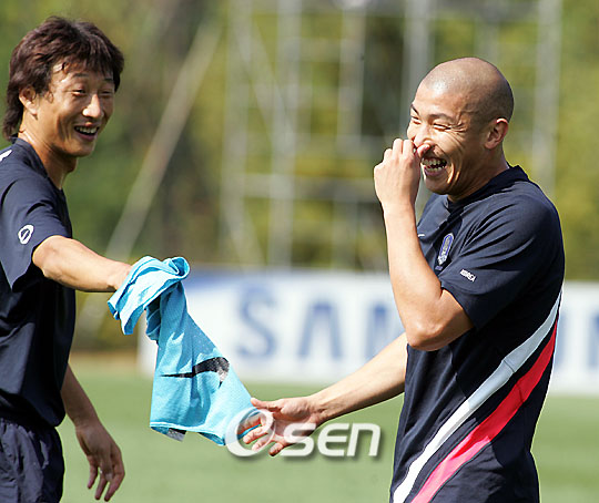 '폭주기관차' 차두리(26, 마인츠)가 '식사마' 김상식(30, 성남)의 뒤를 이어 대표팀의 새로운 분위기 메이커로 떠오르고 있다. 지난 5일 11개월만에 대표팀에 소집되어 "처음처럼 너무나 설렌다" 며 천진난만한 모습을 보인 차두리는 대표팀의 훈련 내내 선수들의 사기를 북돋우어 주는 감초 역할을 톡톡히 했다. 7일 오전 훈련에 앞서 몸을 풀던 차두리가 약간 재미있는 동작을 선보였다. 이에 훈련을 지도하던 압신 고트비 코치가 "German style?(독일식이냐?)" 고 되물어 대표팀 분위기를 훈훈하게 했다. 공격 전술 훈련 시에도 차두리는 측면 수비에서 열심히 뛰면서 각종 추임새를 넣으며 선수들의 사기를 진작시키기도 했다. 차두리의 감초 역할이 가장 빛을 발한 것은 바로 공간 활용 훈련을 할 때였다. 훈련을 지도한 홍명보 코치는 잘생긴 사람이 파란색 조끼를 입으라고 했고 차두리가 가장 먼저 달려가 조끼를 집어들었다. 그러고는 함께 조끼를 집어든 김진규와 이호 그리고 오장은에게 "너네들은 왜 집어들었냐?" 고 말해 운동장을 웃음바다로 만들었다. 그것을 본 홍코치가 "다들 못생긴 녀석들만 조끼를 입었다" 고 말하며 차두리를 한 방 먹이기도 했다. 11개월만에 대표팀에 복귀해 많은 활동량과 더불어 재미있는 모습으로 대표팀의 분위기를 화기애애하게 만들어가고 있는 차두리. 그의 활기찬 모습이 대표팀 경기에서도 이어지기를 기대해본다. bbadagun@osen.co.kr 파주=손용호 기자 spjj@osen.co.kr