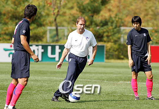 가나와의 설욕전을 하루 앞두고 베어벡 감독이 젊은 선수들을 앞세워 한국팀만의 플레이를 보여줄 것이라고 밝혔다. 7일 파주 국가대표축구팀 트레이닝 센터(파주NFC)에서 오후 훈련을 마친 뒤 인터뷰를 가진 베어벡 감독은 "16명의 선수가 83년 이후 출생한 젊은 선수들" 이라며 "그들 모두 훈련에서 좋은 모습을 보여주었다. 그들의 모습에 만족한다. 가나전은 젊은 선수들에게 좋은 기회가 될 것이다" 고 말하며 가나전에서는 젊은 선수들을 주축으로 세울 것임을 밝혔다. 이날 오후 훈련에서 염기훈(전북)과 정조국(서울) 등을 주축으로 해 젊은 선수들에게 코너킥과 프리킥을 훈련하게 한 베어벡 감독은 "현대축구에서 나오는 골 중 3분의 1정도가 세트피스에서 나온다" 며 그 중요성을 강조했다. 그동안 대표팀 전담 키커였던 이천수가 부상으로 빠진 상황에 대해서는 "이천수가 없는 만큼 다른 키커를 찾아야 한다" 며 "그들이 K리그에서 했던 것처럼 해야 한다" 고 밝혔다. 가나에 대해서는 "방한한 19명의 선수들 중 15명이 월드컵에 뛰었던 멤버인 만큼 최강의 전력" 이라며 "아피아와 에시엔 등으로 구성된 미드필드 라인은 세계 최고 수준" 이라고 평가했다. 지난 6월 스코틀랜드에서의 패배를 통해 많은 것을 배웠다는 베어벡 감독은 "그들의 허리가 세계 최고 수준인 만큼 시간과 공간을 주면 안된다" 며 "6월 당시에는 우리 선수들의 컨디션이 좋지 않았지만 지금은 다르다. 정말 재미있는 경기가 될 것" 이라는 말로 자신감을 드러냈다. 또한 "덧붙여 우리는 우리만의 플레이를 보여주어야 한다" 며 "2008년 올림픽과 2010년 월드컵을 준비하는 만큼 가나와의 경기를 통해 우리만의 플레이를 생각해야 한다. 우리에게도 빠르고 좋은 선수들이 많다" 고 밝혔다. bbadagun@osen.co.kr 파주=손용호 기자 spjj@osen.co.kr
