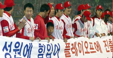 "현대 나와라". 한화 이글스가 2년연속 플레이오프에 진출했다. 한화는 11일 대전구장에서 열린 준플레이오프 3차전에서 이범호의 연타석홈런과 필승계투진을 앞세워 6-4로 KIA를 제압하고 2승1패를 기록, 통산 4번째로 플레이오프 무대를 밟았다. 준플레오프 MVP는 고동진이 선정돼 상금 200만원을 받았다. 홈런 2개를 때린 이범호는 3차전 MVP로 선정됐다. 한화는 지난해에 이어 통산 4번째로 플레이오픙 SK를 3승2패로 누르고 플레이오프에 진출했으나 두산에 1차전부터 3연패했다. 올해는 13일부터(수원구장) 현대와 5전3선승제의 플레이오프를 갖고 한국시리즈 진출을 노크한다. 한화는 초반부터 홈런포로 KIA를 몰아쳤다. KIA 선발투수 이상화가 2회까지는 잘 막았지만 3회부터 볼이 높게 형성되자 이틈을 놓치지 않았다. 3회초 선두타자 김민재가 초구(몸쪽 높은 체인지업)을 걷어올려 왼쪽 담장을 넘기는 선제솔로홈런을 날렸다. 이어진 공격에서 한화는 1사후 고동진의 내야안타와 2사후 김태균의 볼넷으로 만든 1,2루 찬스에서 이날의 히어로 이범호가 좌중월 3점홈런(바깥쪽 높은 싱커)을 쏘아올렸다. KIA는 투수교체를 주저하다 이상화를 밀어붙였지만 결정타를 맞고 말았다. KIA의 반격도 시작했다. 4회초 조경환의 중월솔로홈런으로 한 점을 추격했다. 이어 5회초 2사2,3루 찬스를 잡고 장성호의 볼넷때 폭투로 이어져 또 한점을 추격했다. 그러나 2루주자 이종범이 홈까지 파고들다 횡사, 상승무드에 찬물을 끼얹었다. 위기를 넘긴 한화는 4-2로 앞선 5회말 공격에서 1사후 이범호가 KIA 윤석민을 상대로 좌중월 연타석홈런을 날려 석점차로 도망갔다. 또 5-4로 쫓긴 8회말 2사후 김수연이 회심의 중전적시타를 날려 승리에 쐐기를 박았다. 한화는 포스트시즌 최고령승리투수를 앞둔 송진우를 5회 내리고 최영필에 이어 7회 무사 1루부터 구대성을 올렸다. 구대성은 7회 2사후 이용규와 이종범(2타점)이 연속 2루타를 맞고 4-5까지 추격당했다. 그러나 구대성은 곧바로 기력을 회복해 9회까지 KIA타선을 막고 승리를 지켰다. 최영필이 승리를 안았고 구대성은 최고령(37세2개월9일) 세이브 기록을 세웠다. 승장인 김인식 한화 감독은 "이범호를 5번 타순으로 올린 것이 맞아떨어졌다. 상승 분위기를 타고 있어 현대와의 경기도 해볼만하다. 현대전서 우리 타자들이 잘 쳤다"며 플레이오프 승리도 다짐했다. 한편 패장이 된 서정환 KIA 감독은 "이범호를 막지 못해 졌다. 그러나 우리팀 젊은 선수들이 자신감을 얻은 것이 소득이다. 내년에는 해볼만하다. 성원해준 팬들께 죄송하다"며 내년 시즌을 기약했다.