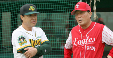 '명품 격돌'. 13일 시작되는 플레이오프는 대한민국 야구 대표 브랜드의 일전이다. '믿음의 야구' 김인식(59) 한화 감독은 특유의 선수에 대한 믿음을 바탕으로 한국시리즈 2회 우승과 WBC 4강 기적을 이룬 뒤 국민 감독으로 승격됐다. '짜내기 야구' 김재박(52) 현대 감독은 '찬스는 곧 득점'의 필승공식을 앞세워 한국시리즈를 네 번이나 제패했다. 이번이 두 감독의 세 번째 만남이다. 김인식 감독이 두산을 맡고 있던 지난 2000년 한국시리즈에서 4승3패로 김재박 감독이 웃었다. 먼저 3연승을 올리고도 내리 3연패한 뒤 7차전에서 가까스로 이겼다. 이듬해 김인식 감독의 복수전이 펼쳐졌다. 플레이오프에서 격돌해 3승1패로 김재박 감독을 누른 뒤 한국시리즈에서 삼성까지 꺾고 우승을 차지했다. 두 감독 모두 단기전에 강하고 나름대로의 치밀한 전략을 갖고 있어 우열을 가리기 쉽지 않다. 올해 상대전적도 9승9패로 승부를 내지 못했다. 서로를 그렇게 부담스럽게 생각하지 않는 것도 비슷하다. 김인식 감독은 상대적으로 열세인 전력으로 한국시리즈 두 차례 우승을 거머쥐었다. 경기설계 능력이 뛰어나고 자신의 밑그림대로 경기를 풀어간다. 항상 노림수를 갖고 있고 승부처에서는 전혀 주저하지 않고 승부수를 띄우는 감각도 뛰어나다. 선수들과의 교감도 잘 이뤄지고 있어 선수들이 감독의 의중을 잘 파악한다. 김재박 감독은 자타가 공인하는 짜내기 야구의 달인. 11년째 팀을 맡아 선수들을 '자동 득점기계'로 만들어놓았다. 선수들은 찬스만 되면 한 치의 오차도 없이 득점을 향해 움직인다. 진루타 희생번트 히트앤드런 등 짜내기 야구의 전형을 보여준다. 수비 시프트도 뛰어나 마치 상대 선수를 향해 옴짝달싹 못하는 거미줄을 친다는 느낌을 받는다. 두 감독들은 아마와 프로를 망라해 서로 한 팀에서 유니폼을 입은 적이 없다. 김인식 감독은 배문고 한일은행 동국대 해태 쌍방울 OB(두산)를 거쳐 한화 지휘봉을 잡았다. 김재박 감독은 대광고 영남대 한국화장품 MBC(LG) 태평양을 거쳐 11년째 현대 감독을 맡고 있다. 지난 3월 WBC대회에서 감독과 코치로 함께한 게 유일했다. 두 명품 감독들 가운데 한 명만 한국시리즈에 진출, 선동렬 감독과 대결을 갖는다. '믿음의 야구'와 '짜내기 야구' 두 브랜드 가운데 누가 웃을까. 올해 플레이오프는 명품을 골라보는 재미가 제법 쏠쏠할 것만 같다.