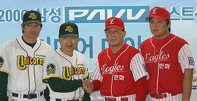 농담 속에 뼈가 있다. 양팀의 필승 작전을 묻는 질문에 한쪽이 농담조로 "깜짝 작전을 펼치겠다"고 말하자 한쪽도 역시 농담으로 "깜짝 작전에 밀어붙이기로 맞서겠다"며 '필승책'을 드러내지 않았다. 12일 한국야구위원회(KBO) 기자회견실에서 열린 '삼성 PAVV 프로야구 플레이오프 미디어데이'에 참석한 2위 팀 현대의 김재박 감독과 준플레이오프를 통과한 3위 팀 한화의 김인식 감독은 시종 화기애애한 분위기에서 출사표를 냈다. 양 감독은 스스럼없이 농담를 주고받는 모습이었지만 '철저하게' 자신들의 플레이오프 작전에 대해서는 밝히지 않았다. 김재박 감독은 '한화전 승리를 위한 비책이 있냐'는 물음에 "작전이라 여기서 밝히기가 그렇다. 아무튼 다양한 작전을 펼치겠다. 깜짝 작전도 있다"며 웃으면서 말할뿐 작전의 구체적 내용에 대해서는 함구했다. 팀배팅 등을 많이 연습했지만 내일 경기에서 보여주겠다고. 그러자 김인식 감독은 "우리는 그럼 깜짝 작전에 밀어붙이기로 대응하겠다"고 농담으로 말하면서도 상대방 칭찬에 열을 올릴 뿐 상대방 격파책에 대해선 피해나갔다. 김 감독은 "사실 걱정이 된다. 준플레이오프를 치르면서 투수들이 체력적으로 지친 게 부담이다. 1, 3, 5번 타순이 터지지 않아 고민"이라면서 "현대는 투타가 가장 안정된 팀이다. 김재박 감독이 한 팀을 오랫동안 맡은 덕분에 게임 운영 능력이 뛰어나다"며 살짝 엄살성 멘트를 날리기도 했다. 그렇지만 김인식 감독은 "정성훈 송지만 이숭용에게 많이 맞았다. 이들을 막는 것이 관건이다. 상대 선발진에 대해 더 연구를 해야겠다. 타선의 변화를 줄 것인지 등은 내일 연습해보고 결정하겠다"면서 구체적인 작전에 대해선 언급을 회피했다. 웃으면서 출사표를 교환하면서도 피할 수 없는 일전에서 승리를 다짐한 두 감독이 과연 어떤 결과를 빚어낼지 플레이오프가 기대된다. 12일 오후 한국야구위원회서 열린 플레이오프 미디어데이 행사에 참석한 한화 김인식 감독과 현대 김재박 감독이 악수로 선전을 다짐하고 있다. 양 감독 좌우로는 선수 대표로 참가한 현대 이숭용과 한화 김태균.