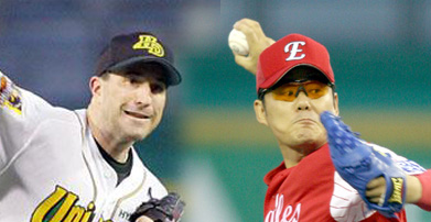 명실상부한 에이스간 맞대결이다. 준플레이오프와 마찬가지로 최대 승부처인 1차전에서 양보할 수 없는 일전을 펼치게 됐다. 13일 오후 6시 수원구장에서 열리는 현대와 한화의 플레이오프 1차전 선발로 캘러웨이와 문동환이 각각 예고됐다. 예상했던 대로 양 팀의 에이스간 충돌이다. 준플레이오프는 한화의 승리로 1차전 승리팀이 100% 진출했다는 통계가 또 한 번 들어맞았다. 플레이오프는 지난해까지 총 22번 중 17차례나 1차전 승리 팀이 한국시리즈에 진출했다. 77.3%의 승률이다. 이처럼 중요한 1차전이기에 에이스가 '선봉장'으로 나서는 것은 당연하다. 캘러웨이는 올 시즌 현대 마운드를 이끌어온 외국인 우완 에이스. 한화 문동환도 경험이 풍부한 우완 에이스다. 캘러웨이는 올시즌 14승7패(공동 4위)에 방어율 2.87(6위)로 팀 내에선 다승 공동 1위, 방어율 2위를 기록했다. 시즌 중반 주춤하기도 했지만 지난 8월 15일 두산전 이후 내리 7연승을 달리며 에이스의 위용을 과시했다. 140㎞대 중반의 빠른 공과 너클 커브 등 다양한 변화구로 상대를 농락한다. 올해 새로 레퍼터리로 장착한 너클 포크볼의 위력이 대단하다. 한화전에는 4경기에 나와 2승1패 방어율 1.50의 호성적을 기록했다. 한화로선 캘러웨이를 어떻게 공략할 것인가가 관건이다. 한화는 준플레이오프서 상승세를 탔던 고동진 이범호의 화끈한 공격력을 앞세워 1차전 승리를 따낼 태세다. 문동환 역시 한화 승리를 위해 주무기인 '돌직구'의 위력을 과시할 전망이다. 문동환은 묵직한 직구 외에 슬라이더, 체인지업이 뛰어나다. 문동환도 정규 시즌서 역시 현대에 강했다. 올 시즌 16승 중 3승을 현대전에서 얻었고 방어율도 2.86으로 시즌 방어율(3.05)보다 좋다. 게다가 지난 6월 30일 9이닝을 6안타 무실점으로 7년 만에 완봉승의 기쁨을 누렸던 상대가 바로 현대였다. 김인식 감독은 12일 미디어데이 행사에서 "문동환-류현진의 선발 로테이션을 준플레이오프 때처럼 고수할 수 밖에 없다. 3, 4위팀의 불리한 점이다. 바꾸고 싶어도 시간적으로 할 수가 없다"며 문동환을 1차전 선발로 내세운 배경을 설명했다. 하지만 KIA와의 준플레이오프에서 한 번도 등판하지 않았던 정민철이 현대전에 좋은 기록(2승1패, 방어율 2.57)을 가지고 있음에도 불구하고 에이스인 문동환을 1차전 선발로 꺼내 든 것은 역시 '믿음의 야구'임을 보여주는 대목이다. 에이스이므로 1차전 선발로 출격, 기대에 부응할 것이란 믿음을 갖고 있는 것이다. 플레이오프 승부의 향방이 걸려 있는 1차전서 과연 누가 웃게 될지 지켜볼 일이다.