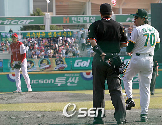"여우야! 여우야! 뭐하니?". 플레이오프 2차전이 열린 14일 수원구장. 3회말 현대 공격 도중 3루측 한화 웅원석에서 난 데 없이 들려려온 '조롱성 야유'였다. 정민철의 투구폼을 두고 김재박 현대 감독이 돌연 덕아웃에서 나와 2분 여에 걸쳐 항의하자(사진) 한화 팬들은 심리전이라고 판단한 듯했다. 실제 현대는 3회초까지 0-2로 뒤졌다. 좌완 신인 선발 장원삼이 2⅓이닝 만에 강판되는 등 흐름상 끌려갔다. 장원삼은 1회초 한화 4번 김태균에게 투런홈런을 맞는 등 매 이닝 안타를 맞으며 위기에 몰렸다. 반면 현대 타선은 2회까지 도루 실패에 힘없는 내야땅볼을 거듭하며 정민철의 노련미에 끌려갔다. 이 시점에서 김 감독은 3회 선두타자 김동수 타석 때 정민철이 초구에 116km 변화구로 볼을 기록한 뒤 덕아웃에서 나와 투구폼에 대해 '딴죽'을 걸고 들어간 것이다. 이 항의의 효력은 어땠을까. 김동수는 곧바로 빗맞은 우전안타를 치고 나갔고 보내기 번트에 이은 후속 서한규의 우전안타로 1사 1,3루 찬스를 잡았다. 그러나 1번 송지만이 볼 카운트 투 볼에서 정민철의 125km 변화구를 제대로 잡아당겼으나 3루수 이범호 정면으로 가면서 병살타로 끝나고 말았다. sgoi@osen.co.kr