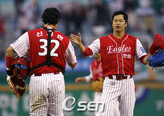 사실 '깜짝 야구'는 김인식 감독이 하고 있다?. 김재박 현대 감독의 "깜짝 야구" 발언이 플레이오프 1,2차전 화두로 떠올랐지만 실제 경기 운용을 놓고 보면 김인식 감독의 전술이 더 의외인 구석이 많다. 일단 한화가 4-3으로 승리한 2차전에서 김 감독은 2회초부터 8번 신경현에게 보내기 번트를 지시했다. 1회 4번 김태균의 투런홈런으로 2-0으로 앞서나갔지만 김 감독은 초반부터 다득점이 아닌 1점이 더 필요하다고 판단한 모양이다. 신경현은 6회에도 무사 1루에서 번트를 시도했다. 그러나 1차례 실패 뒤 강공으로 전환해 우전안타를 만들어냈다. 실제 이날 번트 횟수에서도 한화가 현대보다 2-1로 앞섰다. 공격보다 더 극적인 변화는 마운드의 불펜진 운용이다. 이미 2차전 선발부터 투수 3관왕 류현진이 아닌 정민철을 지목해 현대 김재박 감독조차 '놀래킨' 김 감독은 7회 투아웃부터 마무리 구대성을 등판시켰다. 지난 11일 KIA와의 준플레이오프 3차전에 이은 두 번째 초강수다. 정규시즌서는 단 한 번도 구대성을 7회에 올린 적이 없는 김 감독이었다. 김 감독은 이에 대해 "우리 팀 불펜이 현대보다 약한 게 사실이다. 상대는 불펜투수들의 실력이 비슷하지만 우리는 투수마다 차이가 난다. 그래서 나갈 때마다 이길 수는 없지만 이겨야 되는 경기에는 권준헌-구대성을 조기 투입할 것"이라고 밝혔다. 즉 이기는 불펜조와 그렇지 않은 불펜조로 나눠서 포스트시즌에 임하고 있다는 의미로 받아들일 부분이다. 이 연장선상에서 김 감독이 KIA와의 준플레이오프 2차전과 현대와의 플레이오프 1차전을 경기 중 포기한 것도 이해할 수 있다. 이미 김 감독은 WBC(월드 베이스볼 클래식)에서 이 같은 투수 운용법으로 퍼펙트 4강을 이뤄낸 바 있다. 7점차로 지나 1점차로 이기나 어차피 똑같은 1승 1패라는 점을 실증적으로 보여준 김인식 감독이다. sgoi@osen.co.kr 지난 14일 플레이오프 1차전서 7회 2사 후 등판, 세이브를 올린 한화의 마무리 구대성이 포수 신경현과 악수를 나누고 있다./수원=김영민 기자ajyoung@osen.co.kr