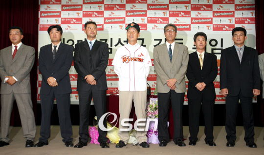 SK는 15일 신임 김성근 감독의 취임식에 맞춰 2007시즌 코치진도 발표했다. 2년간 연봉 1억 3000만 원에 이만수 시카고 화이트삭스 불펜코치를 수석코치로 영입한 것을 비롯 김상진 투수코치, 김경기 타격코치, 이광길 수비코치, 박종훈 주루 겸 외야 수비코치, 박철영 배터리 코치, 이홍범 트레이닝 총괄 코치가 1군 코칭스태프로 선임됐다. 2군은 계형철 감독, 최일언 투수코치, 김성래 김기태 타격코치, 최태원 수비코치로 짜여졌다. 1군 투수와 타격코치 각 1명과 2군 배터리 코치는 추후 선임될 예정이다. 특히 메이저리그에서 복귀하는 이만수 수석코치는 미국에 있는 관계로 김 감독 취임식에 참석하지 못했지만 김 감독은 "이미 일본에서 전화로 대화했다"고 밝혔다. 김 감독은 "여전히 활발한 목소리를 듣고 '같이 일하게 되서 잘됐구나'하는 생각이 들었다. 한국 프로야구가 팬들에게 활발히 어필하는 부분이 부족하니까 초빙자라 여기겠다. 나는 일본에서 2년이지만 그 친구는 미국에서 10년 가까이 했으니 새로운 것 가져오지 않겠는가. 과거 초창기 활약했고 스타이니까 그것도 한국야구에 필요하지 않겠는가. 인천-한국야구에 많은 도움이 될 듯하다"고 사전 교감을 이미 가졌음을 밝혔다. 인사권자인 신영철 SK 와이번스 사장 역시 '이만수-김성근 조합'에 대한 질문을 받자 "일본-미국 야구를 보며 부러운 부분이 팬들을 위한 스포츠를 한다는 점이었다. 물론 핵심적 상품은 이기는 것이다. 그러나 거기에 그치지 않고 엔터테인먼트적 요소가 들어가야 한다. 야구장을 하나의 공연장으로 보고, 감독-코치-선수들은 엔터테이너가 되어야 한다. 김성근 감독이 이기는 부분에서 가장 적임자라 생각했다"라고 선임 이유를 설명했다. sgoi@osen.co.kr 김성근 감독이 코치들과 나란히 포즈를 취하고 있다./인천=박영태 기자 ds3fan@osen.co.kr