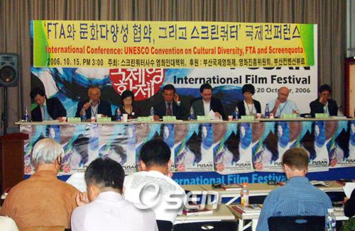 10월 15일 오후 3시 부산 해운대 PIFF 파빌리온 컨퍼런스룸에서 열린 ‘FTA와 문화다양성 협약, 그리고 스크린쿼터’ 국제컨퍼런스가 지난 7월 1일 절반으로 줄어든 ‘한국영화 스크린쿼터를 원상회복하라’는 공동선언문을 채택했다. 이날 컨퍼런스에는 한국의 양기환 스크린문화연대 사무처장 겸 세계문화기구를 위한 연대회의 집행위원장, 이해영 한신대 국제관계학부 교수 겸 영화 대책위 정책위원장, 방은진 감독을 비롯해 파스칼 로가드(프랑스 문화다양성연대 의장), 알프레도 구롤라(멕시코 영화감독노조 위원장), 제인 유(대만 다큐멘터리영화제 집행위원장), 짐 맥키(캐나다 CCD 국제협력국장), 로버트 케글(미국 어바나 샴페인대학 영화학부 교수), 끌로드 미셜(프랑스 CGT 공연예술노조 위원장)이 참석했다. 이들은 컨퍼런스가 끝난 후 공동선언문을 통해 “프랑스 캐나다 멕시코 미국 대만 한국의 무대예술, 작가, 감독, 작곡, 기술, 시각예술, 독립영화, 출판, 방송, 독립영화 배급, 음악계를 대표하는 우리들과 36개국 국제문화 전문가 단체를 대표하는 국제운영위원회는 한국 문화계와 함께 한국 정부가 스크린쿼터를 원래 수준인 40%로 원상회복할 것을 강력히 요구한다”고 밝혔다. 이들은 한국의 스크린쿼터를 ‘효율적 문화정책의 좋은 예’라며 한국영화가 한국관객을 만날 수 있게 했고, 국내에서 거둔 한국영화의 성공은 한국영화가 세계로 뻗어나갈 수 있는 발판이 됐다고 주장했다. 하지만 스크린쿼터를 절반으로 축소함으로써 위기에 직면했고, 아예 제작에 들어가지조차 못하는 실질적 위험에 처하게 된다고 덧붙였다. 이들은 마지막으로 유네스코 문화다양성협약의 정신에 따라 한국 정부가 스크린쿼터를 원상회복함으로써 자국의 고유한 문화 정책 원리를 확인하고 지킬 것을 강력히 요구했다. 한편 이날 컨퍼런스는 파스칼 로가드의 기조연설을 시작으로 1부 ‘한미자유무역협정과 스크린쿼터:대표적 위기 사례’, 2부 ‘유네스코 문화다양성 협약: 왜 국제법상으로 무역협정을 견제할 필요가 있는가?’ 발제가 이어졌다. pharos@osen.co.kr