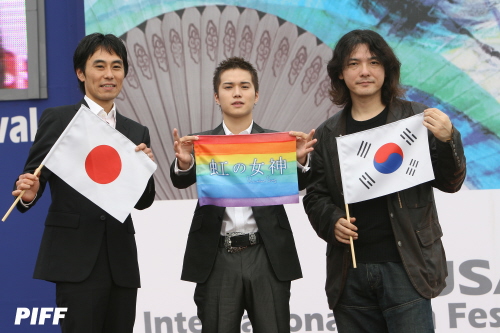 제11회 부산국제영화제에 참석하기 위해 방한한 일본배우 이치하라 하야토가 깜짝 퍼포먼스를 펼친 동영상이 화제가 되고 있다. 이치하라 하야토는 ‘아시안필름마켓-스타 서밋 아시아’와 새 영화 ‘무지개 여신’ 홍보를 위해 10월 15일 김해공항을 통해 입국했다. 이날 처음으로 한국을 방문한 이치하라 하야토는 100여명의 팬들이 손수 만든 선물과 자신이 좋아하는 파란색 풍선, 현수막을 들고 나타나 열렬히 환영하자 영화제 의전담당 차에 오르는 깜짝 퍼포먼스를 벌였다. 이치하라 하야토는 팬들의 성원에 무언가 답례를 해야겠다고 생각해 차량 뒷좌석의 창문을 내리고 지붕위로 올라가 두 팔을 번쩍 들어 팬들의 성원에 화답했다. 이치하라 하야토는 17일 부산 해운대 파빌리온 광장에서 진행된 무대인사에서도 영화 현수막을 들고 나와 한국 팬들의 뜨거운 환영에 답례하기도 했다. 한편 이치하라 하야토와 우에노 쥬리, 아오이 유우가 주연한 ‘무지개 여신’은 11월 말 국내 개봉할 예정이다. pharos@osen.co.kr 부산국제영화제 야외무대에 나선 이치하라 하야토(가운데)가 영화 제목이 쓰여진 현수막을 들고 있다. /PIFF 집행위 제공.
