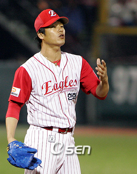 한국시리즈 우승의 중요한 분수령이 될 2006 한국시리즈 3차전 한화 이글스와 삼성 라이온즈의 경기가 25일 대전야구장에서 벌어져 삼성이 연장 12회 선발투수 배영수를 마무리로 투입하는 강수 끝에 4-3의 극적인 승리를 거두었다. 삼성의 12회초 진갑용이 자신의 투구에 맞은 뒤 약간의 실랑이가 벌어지자 한화의 구대성이 1루에 진루한 진갑용을 향해 '내가 고의로 던졌겠냐'는 제스처를 취하고 있다./대전=손용호 기자spjj@osen.co.kr