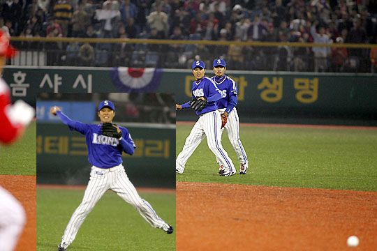 "방망이는 못 믿는다"라고 선동렬 삼성 감독은 줄곧 말한다. 그렇다면 선 감독은 확률적으로 무엇을 믿을까. 바로 마운드와 수비다. 이것이 삼성의 '지키는 야구'의 요체다. 그리고 이번 한국시리즈 들어 특히 4차전에서 삼성 수비의 위력은 제대로 드러났다. 그 중핵은 유격수 박진만이다. WBC(월드 베이스볼 클래식) 때부터 멕시코 등 상대 팀 감독은 물론 ESPN 등 미국 유수 언론으로부터 공인받은 박진만의 수비 실력은 이번 한국시리즈에서도 고비마다 삼성을 살려냈다. 특히 4차전에서 박진만은 승부의 흐름을 삼성 쪽으로 돌리는 결정적 수비를 5차례에 걸쳐 해냈다. 먼저 2회말 1사 1,2루에서 백재호의 2루 땅볼 때 타자주자 백재호를 아웃시킨 뒤 2루로 송구된 공을 받자마자 감각적으로 포수 진갑용에게 뿌려 홈으로 돌진하던 2루주자 이범호를 잡아냈다. 박진만의 넓은 시야와 숙련된 감각에 한화는 더블 아웃으로 기회를 날렸다. 이어 박진만은 3,4회 잇따라 신경현과 김민재의 안타성 타구를 캐치, 아웃시켰다. 위치 선정 능력과 어깨에서 한국 최고 수준의 유격수임을 입증해주는 수비였다. 삼성이 최대 고비에 몰렸던 9,10회에도 마무리는 박진만의 글러브에서 이뤄졌다. 9회말 끝내기 위기였던 2사 2루에서 심광호, 10회말 2사 2,3루에서 김태균의 2유간으로 흐르는 땅볼을 잡아내 삼성의 4-2 승리를 지켰다. 여기다 박진만은 덤으로 타격에서도 3차전 이후 5번타자로 중용돼 득점 가뭄의 물꼬를 터주고 있다. 3차전은 연장 12회초 구대성을 무너뜨리는 결승안타를 쳐냈고 4차전에서도 10회초 중전안타로 출루, 결승 득점을 올렸다. WBC 당시 멕시코 감독은 8강리그전 패배 후 "박진만 때문에 졌다. 그에게 가는 타구는 전부 아웃"이라고 한탄했는데 한화의 김인식 감독 역시 지난 26일 같은 기분이었을 것 같다. 단기전에서 박진만의 철벽 수비는 플러스 요인이 아닐 수 없다. sgoi@osen.co.kr 지난 26일 4차전서 박진만이 한화 신경현의 3유간 깊숙한 타구를 잡아 외야 잔디 지역에서 점프 스로로 아웃시키고 있는 모습.