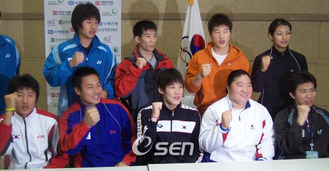 카타르 도하 아시안게임을 30일 앞두고 1일 서울 태릉선수촌에서 열린 대표팀 기자회견을 시작하기 전에 선수들이 선전을 다짐하는 파이팅을 외치고 있다. 뒷줄 왼쪽부터 시계방향으로 이재진(배드민턴) 양태영(체조) 이원희(남자유도) 배은혜(여자유도) 유승민(남자탁구) 장미란(여자역도) 박태환(남자수영 자유형) 박재명(남자육상 창던지기) 김덕현(남자육상 세단뛰기). /태릉=박상현 기자 tankpark@osen.co.kr