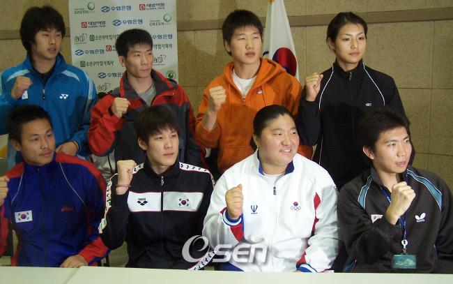 카타르 도하 아시안게임을 30일 앞두고 1일 서울 태릉선수촌에서 열린 대표팀 기자회견을 시작하기 전에 선수들이 선전을 다짐하는 파이팅을 외치고 있다. 뒷줄 왼쪽부터 시계방향으로 이재진(배드민턴) 양태영(체조) 이원희(남자유도) 배은혜(여자유도) 유승민(남자탁구) 장미란(여자역도) 박태환(남자수영 자유형) 박재명(남자육상 창던지기). /태릉=박상현 기자 tankpark@osen.co.kr