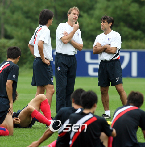 '세 마리 토끼를 쫓다가 한 마리도 못 잡으면 어떡하나?'. 1인 3역에 도전하는 베어벡 감독. 오는 12월 아시안게임과 2007년 아시안컵 그리고 2008년 베이징올림픽 대표팀 감독을 겸임하고 있는 그가 과연 세 마리 토끼를 다 잡을 수 있을 것인가가 축구팬들의 관심이 되고 있다. 팬들은 11월 들어 베어벡 감독이 너무나 바쁜 일정을 소화해내며 대표팀 업무의 능률이 낮아질 것을 우려하고 있다. 우선 베어벡 감독은 오는 15일 이란과의 아시안컵 예선전을 준비하고 있다. 이와 동시에 14일 창원에서 벌어지는 올림픽 대표팀 한일전에 출전할 선수들의 명단을 뽑아야만 했다. 또한 유럽을 돌아다니면서 향후 있을 유럽파 선수들 차출을 위해 소속 클럽 감독과도 면담을 했다. 이렇듯 베어벡 감독의 일정은 너무나 빠듯하다. 이에 베어벡 감독 자신도 너무나 많은 일정에 아쉬움을 드러냈다. 그는 6일 오후 축구협회 5층 대회의실에서 가진 기자회견에서 "중요 대회를 앞두고 너무나 복잡한 상황에 있다. 솔직한 심정을 물으면 세계 그 어느 지도자가 만족한다고 말하겠는가?" 라며 심정을 밝혔다. 하지만 그는 "중요한 것은 주어진 상황에서 최적의 길을 찾는 것이다" 라며 어려운 현실에 안주하지 않고 헤쳐나갈 것을 다짐했다. 비록 베어벡 감독의 결의는 인상적이지만 너무나도 많은 업무량으로 인해 밀도가 낮아지는 경향을 보여준 것은 사실이었다. 이날 베어벡 감독은 이란전에 뛸 선수들과 한일전 참가 선수들을 발표하면서 이승현(부산)을 중복해 말하기도 했다. 대표팀 코칭스태프는 감독을 제외하고 단 3명이다. 이들이 62명에 이르는 아시안게임 대표와 올림픽 대표 선수들을 일일이 다 관리하기에는 무리가 있다. 여기에 기존 국가대표 멤버들도 존재하고 있다. 세 마리 토끼를 잡으려고 하는 베어벡호. 과연 그들이 그 많은 업무를 수행하면서도 밀도까지 높일 수 있을지 앞으로 지켜볼 일이다. bbadagun@osen.co.kr
