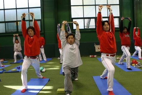 KIA 타이거즈가 7일부터 내년 1월 중순까지 광주 무등경기장 야구장 실내 훈련장인 호승관에서 본격적인 요가 훈련을 실시하고 있다. 요가 훈련은 본격적인 훈련에 들어가기 전인 오전 9시반부터 10시반까지 1시간 동안 한국 웃음요가 연구소 김영식 원장의 지도로 진행된다. 요가 훈련은 평소 사용하지 않는 근육을 풀어주고 심리적인 트레이닝을 함으로써 선수들의 경기력을 향상 및 부상 예방 등을 선수 스스로 컨트롤할 수 있기 위한 것이다. 특히 각 선수 개개인의 포지션별로 사용근육과 필요한 동작에 맞춘 훈련을 통해 유연성을 강화하고 고른 자세를 유지토록 할 예정이다. 훈련 1주차에는 선수 개인별로 몸상태를 파악하고 기본 동작을 숙지한 뒤 2주차부터 포지션별 요가처방과 개인훈련 방법 숙달에 들어간다. 그리고 3주차에는 근육 이완법 및 비사용 근육 처방법을 통한 집중 훈련, 4주차에는 명상과 이완을 겸한 마인드 컨트롤, 5주차부터는 유연성 유지를 위한 수련과 운동 전후의 동작 등을 단계별로 익히게 된다. 요가 훈련을 받고 있는 KIA 선수단=KIA 타이거즈 제공.