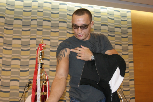 "한국인이라는 자부심 때문에 오른팔을 쓰지 못하는 부상을 이겨내고 결승전에 임했다. 챔피언 벨트를 차지했다면 더없이 좋았겠지만 나의 모든 것을 쏟았기 때문에 실망하지 않는다". 지난 5일 일본 요코하마 어리나에서 열린 프라이드 FC 부시도 13 웰터급 그랑프리 파이널에서 아쉽게 준우승을 차지한 '푸른 눈의 슈퍼 코리안' 데니스 강(29, 아메리칸탑팀-스피릿 MC)이 우승를 차지하지 못했지만 결과에 만족한다고 밝혔다. 데니스 강은 7일 서울 명동 로얄호텔에서 가진 기자회견에서 "나는 분명한 한국인이기 때문에 태극기와 애국가를 선택했고 한국인이라는 자부심을 갖고 부상에도 불구하고 결승전에 임했다"며 "오른팔을 전혀 쓰지 못하는 불리함 속에서도 열심히 싸웠기 때문에 전혀 후회하지 않는다"고 말했다. 이어 데니스 강은 "1-2 판정패가 나왔지만 충분히 받아들일 수 있는 결과"라며 "만약 미사키 가즈오(일본)가 지는 결과가 나왔다면 오히려 미사키가 불만을 가질 수 있다. 판정에 100% 만족하지 않지만 받아들인다"고 덧붙였다. 다음은 데니스 강과의 일문일답. - 아쉽게 준우승했는데 소감은. ▲ 챔피언 벨트를 차지했더라면 더없이 좋았겠지만 결과에 만족한다. 부상 때문에 힘든 경기를 했지만 나의 모든 것을 쏟아부었기 때문에 후회하지 않는다. - 미사키와의 결승전 판정결과를 받아들이는지. ▲ 1-2 판정패였지만 불만은 없다. 완전히 만족할 수는 없지만 미사키가 판정패했더라면 오히려 미사키가 불만을 가졌을 것이다. 판정결과를 받아들인다. - 파울로 필리오 대신에 미사키가 나왔는데. ▲ 결승전 시작 30분전에 미사키로 대체됐다는 소식을 듣고 당황스러워 경기에 집중하기 어려웠다. 하지만 왜 바뀌었는지에 대해 깊이 생각한다면 오히려 경기 집중에 방해되기 때문에 미사키에 대한 전략을 짧은 시간에 수립했다. 결국 그라운딩과 파운딩 기술로 미사키를 제압하겠다는 작전을 세웠고 초반 경기를 유리하게 이끌어갈 수 있었다. - 4강전에서 부상이 있었는데. ▲ 고노 아키히로(일본)과 싸우고 나서 오른쪽 어깨부근에 탁구공만한 혹이 생겼다. 팔뚝 부분의 근육인데 어깨 근육과 연결되어 있어 결승전에서는 전혀 오른팔을 쓰지 못했다. 곧 의사 진찰을 받고 치료 또는 수술 여부를 결정해 빨리 회복하고 다시 훈련에 돌입하고 싶다. - 미사키와 다시 싸운다면. ▲ 나는 고노와 15분동안 싸웠고 미사키는 4강전에서 겨우 9분을 싸웠을 뿐이다. 체력이나 부상 등 몸상태가 같은 원매치라면 충분히 이길 수 있다. - 경기 초반 유리하게 이끌다가 반격을 당했는데. ▲ 통증이 심해졌고 체력이 많이 떨어진데다 눈부위 상처까지 나는 등 여러 악재가 겹쳐 집중력이 흐트러지는 바람에 1라운드 후반 좋지 않은 모습을 보여줬다. 반격을 당해 아쉽다. - 웰터급에서 가장 잘하는 선수는 누구라고 생각하는지. ▲ 당연히 나다.(웃음) 하지만 나를 빼놓고는 댄 핸더슨(미국)이 아직도 최강자라고 생각한다. 내년에는 웰터급 그랑프리가 없는데 부상에서 회복되는대로 훈련에 돌입해 내년 상반기 중에 타이틀전 기회를 갖고 싶다. - 결승전에 애국가와 태극기가 나왔는데. ▲ 내가 선택한 것이다. 한국은 아버지의 나라고 아버지는 내가 격투기계로 진출할 수 있는 계기를 만들어준 분이다. 프라이드에서 애국가와 태극기를 선택한 것은 너무나 당연하다. 애국가와 태극기가 나오면서 한국인에 대한 자부심을 느꼈고 한국팬들의 응원을 다시 되새긴 덕분에 오른팔 부상을 극복하고 결승전에서 내 모든 것을 쏟아부을 수 있었다. - 앞으로의 계획은. ▲ 이번 그랑프리를 치르면서 우승하려면 얼마나 많은 훈련을 해야하는지 알게 됐다. 지금까지는 주짓수를 잘한다고 생각하고 복싱기술만 너무 집중했는데 오히려 주짓수 기술이 줄어드는 것 같다. 부상에서 완쾌되면 다시 주짓수부터 연습하고 기량을 가다듬어 내년을 준비하겠다. tankpark@osen.co.kr 데니스 강이 7일 서울 명동 로얄호텔에서 가진 기자회견을 마친 뒤 오른팔 근육 부상으로 생긴 탁구공 모양의 혹을 가리키고 있다. /엔트리안 제공