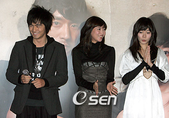 케이블 TV OCN이 지상파 드라마에 도전장을 낸, 배두나 김민준 이진욱 오윤아 주연의 16부작 미니시리즈 '썸데이'의 시사회가 8일 신촌 메가박스에서 열렸다. 한 기자의 사랑관에 대한 질문에 이진욱이 '사랑은 준비된 자 만이 누릴수 있는 특권' 이라는 명언(?)을 남기자 옆에 있던 배두나가 놀라는 표정을 짓고 있다./손용호 기자spjj@osen.co.kr