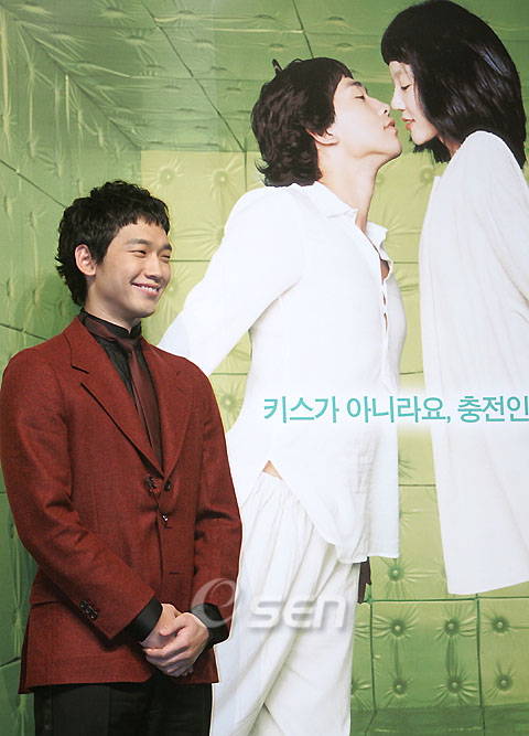 박찬욱 감독이 메가폰을 잡고 임수정 정지훈(비)이 주연을 맡은 '싸이보그지만 괜찮아'의 제작보고회가 9일 서울 임피리얼 팰리스호텔에서 열렸다. 이 영화는 정신병원을 배경으로 싸이보그라고 착각하는 영군(임수정), 남의 특징을 훔칠수 있다고 생각하는 일순(비) 등 다양한 캐릭터가 나와 영화를 이끌어 나간다. 비(정지훈)가 임수정과의 대형 키스신 포스터 앞에서 활짝 웃으며 포즈를 취하고 있다./손용호 기자spjj@osen.co.kr
