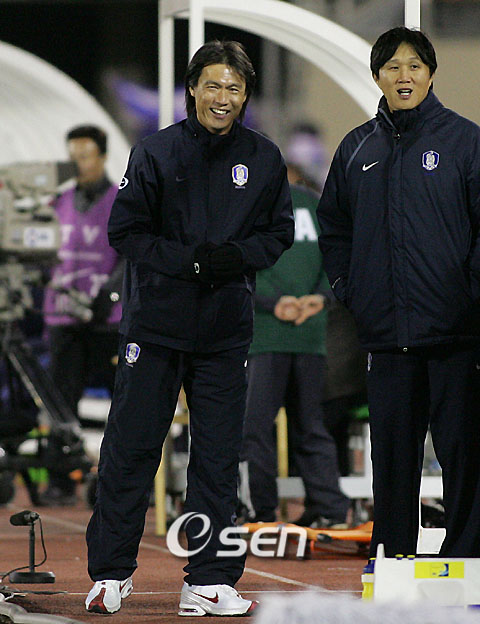 국가대표팀 홍명보 코치가 올림픽대표팀의 감독을 맡아 14일 창원 종합운동장에서 일본 올림픽대표팀을 맞아 치른 평가전은 전반 박주영의 선제골로 앞서 나가다 후반 안태은의 동점 자책골로 아쉬운 1-1 무승부를 기록했다. 후반 몇차례의 결정적인 슈팅이 골포스트를 맞거나 골키퍼 정면으로 가자 홍명보 감독이 웃고 있다./창원=손용호 기자spjj@osen.co.kr