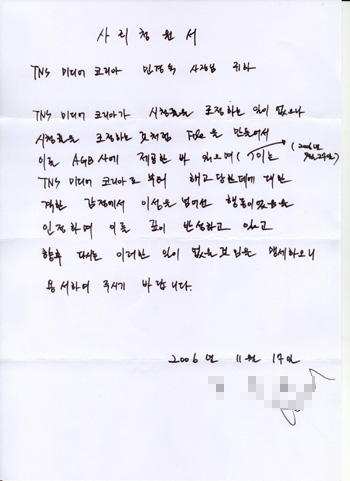 시청률을 조작했다고 AGB닐슨미디어리서치에 제보한 혐의를 받고 있는 TNS미디어코리아의 전 직원이 직접 쓴 사죄청원서가 공개됐다. 이 고백으로 SBS와 TNS간에는 시청률 조작을 둘러싼 논쟁이 벌어지고 있다. 이 직원은 “TNS미디어코리아가 시청률을 조작하는 일이 없으나 시청률을 조정하는 것처럼 파일을 만들어 이를 AGB사에 제공했으며 이는 TNS미디어코리아로부터 해고당한데 대한 격한 감정에서 이성을 넘어선 행동이었음을 인정하며 이를 깊이 반성하고 있고 향후 다시는 이런 일이 없을 것임을 맹세하오니 용서하여 주시기 바란다”고 사죄의 뜻을 밝혔다. hellow0827@osen.co.kr