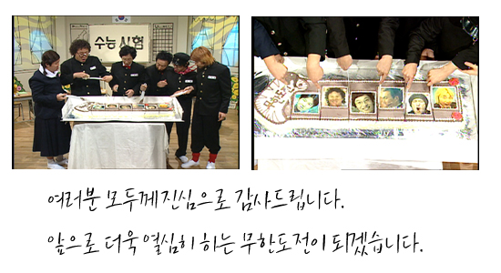 MBC 주말 예능프로그램 ‘무한도전’(여운혁 김태호 연출) 제작진이 홈페이지 게시판을 통해 시청자들에게 감사 인사를 전했다. ‘무한도전’ 출연자(유재석 노홍철 박명수 정준하 정형돈 하하)들과 제작진 일동은 “‘무한도전’은 시청자 여러분들의 성원에 힘입어 따뜻한 하루하루를 보내고 있다”고 밝혔다. 또 “매일매일 게시판에 올려주시는 많은 의견과 각종 인터넷 사이트에서 볼 수 있는 무한도전 패러디와 멤버들에 대한 분석 등 시청자 여러분들의 많은 성원과 질책에 멤버들과 제작진 모두 귀를 기울이고 있다”고 덧붙였다. 특히 제작진은 최근 미국에서 멤버들의 사진이 들어간 대형 케이크를 보내 준 사연을 공개하며 “시청자들이 보내준 선물과 편지가 멤버들에게 기쁨이 되고 있다”고 전했다. 제작진 일동은 마지막으로 다시한번 모든 시청자들에게 감사의 뜻을 전하며 “앞으로 더욱 열심히하는 무한도전이 되겠다”고 의욕을 보였다. 한편 11월 18일 오후에 방송된 ‘무한도전’은 전국시청률 16.9%(TNS미디어코리아 집계)로 이날 방송 3사 예능프로그램 중 최고 시청률을 기록했다. pharos@osen.co.kr
