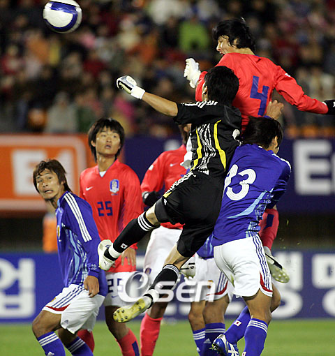 한국 올림픽대표팀이 적지에서 무승무를 기록했다. 박주영, 오장은 등 주전 멤버 4명이 빠진 한국은 21일 저녁 도쿄 국립경기장에서 열린 일본 올림픽대표팀과의 정기전에서 양동현의 멋진 슈팅에 힘입어 1-0으로 앞서나갔으나 후반 29분 마스다에게 동점골을 내주며 승리를 놓쳤다. ▲ 일본의 파상공세가 펼쳐져 일본은 홈에서 경기하는만큼 한국을 계속 몰아붙였다. 특히 미즈노 고키를 앞세운 사이드에서의 공격은 상당히 날카로웠다. 전반 3분 마스다 지카시가 슈팅한 것을 이강진이 걷어냈다. 전반 4분 미즈노는 왼쪽 사이드를 파고들며 한국의 수비수를 제친 후 낮고 빠른 크로스를 연결했지만 양동원 골키퍼의 손에 걸리고 말았다. 비록 골을 기록하지는 못했지만 일본의 공세는 날카로웠다. 한국 역시 전반 13분 상대 수비 실수를 틈타 이근호가 페널티 에어리어 중앙에서 헤딩슛으로 연결했지만 아쉽게 골문을 빗나가고 말았다. 하지만 주도권은 일본에게 있었다. 전반 19분 왼쪽에서 크게 날아오는 대각선 크로스를 오른쪽 사이드에서 미즈노가 날카로운 크로스로 연결했다. 23분에도 미즈노가 올린 크로스가 히라야마에게 향했으나 이강진이 노련한 수비로 막아냈다. 3분 후에는 가지야마 요헤이가 아크 정면에서 오른발 슈팅을 날리기도 했다. 한국은 26분 김승용의 크로스를 이근호가 떨구어주고 쇄도하던 공격수가 슈팅해 골로 연결되었으나 그 전 상황에서 골라인 아웃이라는 판정을 받아 아쉬워하기도 했다. ▲ 한국의 집중력이 결국 선제골로 전반 32분 일본은 고케구치 다쿠야가 헤딩슛을 시도했다. 5분 후에는 중앙에서 연이은 패스로 공간을 만든 후 페널티 에어리어로 침투해 슈팅까지 시도했으나 이강진에게 걸렸다. 39분에는 미즈노의 프리킥이 골대를 맞는 등 일본은 경기를 압도했다. 일본에게 계속 밀리던 한국은 집중력을 발휘했다. 전반 44분 김승용의 프리킥을 이근호가 쇄도하면서 잘라먹는 헤딩슛을 연결했지만 일본 골키퍼의 얼굴에 걸리며 아쉬움을 넘겼다. 하지만 1분 후 한국의 선제골이 터졌다. 양동현은 페널티 에어리어에서 드리블로 상대 수비 세 명을 제치고 침투한 후 날카로운 오른발 슈팅을 연결하며 골을 뽑아냈다. ▲ 한국 초반 공세 후 일본이 주도권 되찾아 후반으로 들어서자 한국은 자신감을 회복했다. 후반 1분 김승용의 크로스를 정인환이 헤딩슛으로 연결해 골문으로 향했지만 히라야마가 머리로 걷어냈다. 4분에는 천제훈이 치고 들어가다 일본의 수비에 걸려 넘어졌지만 주심은 페널티킥을 선언하지 않았다. 이같은 한국의 공세에 흔들렸던 일본은 안정을 되찾고 공격에 힘을 실었다. 이에 한국은 그들의 공세를 역이용하려 했지만 양 팀 모두 이렇다 할 상황은 만들지 못했다. 후반 10분 미즈노가 오른쪽에서 올린 크로스가 골대를 맞고 나왔다. 17분에는 아오야마 도시히로의 중거리슛이 나왔고 22분에는 히라야마가 헤딩슛을 시도했다. ▲ 한국 주도권 회복하려는 분위기에서 불의의 일격당해 한국의 베어벡 감독은 이승현을 빼고 박종진을 투입하며 허리에서 키핑력을 강화했다. 후반 26분 박종진이 사이드에서 2대1 패스에 이은 중거리 슈팅을 연결했다. 1분 후에는 이근호 양동현 그리고 김승용으로 이어지는 패스 후 천제훈의 중거리 슈팅이 나오며 경기의 흐름을 가져오는 듯 했다. 그러나 이같이 좋은 흐름에서 한국은 일격을 당했다. 후반 29분 미즈노가 오른쪽에서 올린 크로스를 마스다가 헤딩골로 연결한 것이다. 만회골을 넣자 일본은 상승세를 타기 시작했다. 이에 베어벡 감독은 안태은을 빼고 박희철을 투입하며 미즈노를 견제했다. 일본은 후반 33분 이노하 마사히코의 슈팅이 나오는 등 한국을 공략했다. 또한 소리마치 고지 일본 감독은 여러 선수들을 투입하며 공격을 강화했다. 이후 일본은 이누이 다카시 등을 넣으며 공격을 계속했고 한국은 정인환, 이강진 등이 잘 막아내며 더 이상의 추가골은 기록하지 못하며 무승부로 끝났다. bbadagun@osen.co.kr 지난 14일 창원서 벌어진 올림픽대표팀 한일전.