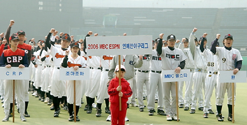 연예인 야구팀 ‘恨’과 ‘조마조마’가 2006 MBC ESPN 연예인 야구리그 최강팀 자리를 놓고 결승에서 맞붙는다. 유재석 이휘재 정준하 박준형 윤종신 등이 소속된 ‘恨’은 8년 전통의 실력파 팀이고, 박상원 이종원 김태균 이문세 이성재가 소속된 ‘조마조마’는 신흥명문 구단이다. 두 팀은 지난 3월 개막전 이후 매달 2경기 씩 풀리그를 거쳐 1위와 2위로 결승에서 맞붙게 됐다. 특히 두 팀은 개막 당시부터 라이벌이라 불릴 만큼 박빙의 승부를 보여줬다. 뿐만 아니라 리그를 진행하는 동안 자주 나오지 못했던 인기스타들이 결승전인 만큼 대거 출전을 통보한 상태다. 연예인 야구 최강팀을 가리는 결승전은 11월 26일 오전 11시 서울 동대문야구장에서 펼쳐진다. pharos@osen.co.kr 2006 MBC ESPN 연예인 야구리그에 출전한 팀들. /MBC ESPN 제공.