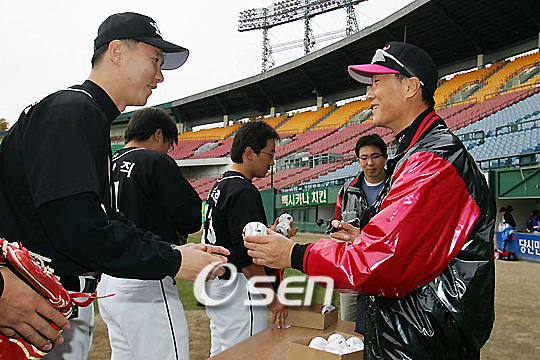 LG 트윈스의 이종렬이 26일 LG 구단주기 야구대회에 참가한 LG 계열사 직장야구팀 선수들을 대상으로 1일 코치로 나서 야구 클리닉을 개최했다. 이종렬은 직접 참가 선수들에게 펑고를 쳐주며 내외야 수비수들의 포구 자세와 송구 동작 그리고 타격폼을 교정해 주었다. 클리닉 후 참가 선수들과 가족들에게 친필 사인볼을 나누어 주며 즐거운 시간을 보냈다. 이종렬이 참가자들에게 사인볼을 나누어 주고 있다./잠실=손용호 기자spjj@osen.co.kr
