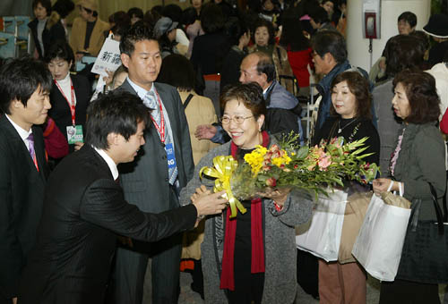 제주도에서 열리는 ‘한류 엑스포’를 찾는 일본 관광객의 발길이 속속 이어지고 있다. 지난 11월 27일에는 배용준의 일본팬 183명을 실은 도쿄 나리타발 대한항공 특별 전세기가 제주 공항에 도착해 한류엑스포 조직위원회 관계자의 영접을 받았다. 이들은 입국장을 나서면서 마중 나온 관계자들에게 “오로지 배용준 씨를 만나러 왔다. 다른 것은 생각이 없다”라고 들뜬 마음을 숨기지 않았다고 한다. 뿐만 아니라 11월은 제주관광 비수기인데도 불구하고 제주로 향하는 비행기 티켓을 구하기가 급작스럽게 어려워졌다는 소식도 있다. 일본에서 출발하는 제주행 항공편은 좌석이 거의 매진된 상태이고 우회 항로인 부산, 서울발 제주행 좌석도 거의 빈 자리를 찾을 수 없을 정도이다. 약 4000여 명으로 예상되는 일본 팬들이 한꺼번에 제주도로 움직이기 때문인 것으로 조직위원회 관계자들은 분석하고 있다. 일본 관광객들이 이처럼 제주행을 서두르는 이유는 배용준을 1년여만에 공식석상에서 볼 수 있는 자리가 마련되기 때문이다. 배용준은 작년 8월 일본 사이타마 슈퍼아레나에서 열렸던 영화 ‘외출’의 일본 개봉 프로모션 무대를 끝으로 공식석상에서 모습을 감추었다. 27일 오후에 도착한 배용준 팬들은 항공편 예약이 어려워지자 아예 전세기편으로 제주도를 찾았다. 이들을 태운 전세기는 3박 4일 일정의 ‘한류 엑스포 투어’ 상품이 마련한 교통편이다. 이 상품은 일본에서 약 15만 엔(119만 7000원)에 팔렸다. 배용준은 29일 오전 10시 반 시작되는 한류 엑스포 개막식과 오후 2시부터 제주 컨벤션센터에서 열리는 개막 축하공연에 홍보대사 자격으로 참석한다. 100c@osen.co.kr 한류 엑스포 조직위원회 관계자의 영접을 받는 일본 관광객.