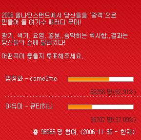 매 공연마다 섹시 여가수를 패러디해 웃음을 선사하고 있는 가수 싸이가 12월 열리는 올나잇스탠드 공연에서도 다시 한번 여자 가수 패러디를 시도한다. 특히 이번에는 어떤 가수를 패러디 할지 싸이의 공식 홈페이지(www.psypark.com)에서 네티즌의 투표로 결정할 예정이라 더욱 관심을 모으고 있다. 이미 약 10만 명에 가까운 네티즌이 투표에 참여했으며 현재는 엄정화의 '컴투미'가 62%(6만 3,000여명)로 37%(3만 7,000여명)의 지지율을 얻고 있는 아유미의 '큐티허니'보다 앞서고 있다. 싸이의 여자 패러디 가수 투표는 이번 주까지 계속 진행된다. 그동안 싸이는 공연에서 박지윤, 보아, 아이비, 이효리 등 그해 가장 인기 있었던 섹시 가수들의 패러디 공연을 펼쳐 관객들의 뜨거운 호응을 얻은 바 있다. 관객을 광객으로 만들어버리겠다는 싸이의 단호한 결심이 무대에서 어떤 퍼포먼스를 탄생시킬지 귀추가 주목된다. hellow0827@osen.co.kr