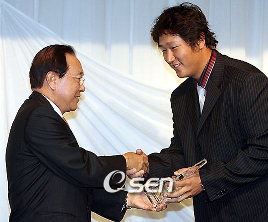 22년 만에 타격부문 트리플 크라운(홈런, 타점, 타율)을 달성하며 거포의 위용을 과시한 이대호(24.롯데)가 마침내 최우수선수상을 수상했다. 투수부문 트리플 크라운을 이룩한 '괴물신인' 류현진(19.한화)에게 밀려 시즌 MVP 등을 놓쳤던 이대호는 12일 중진 야구인들의 모임인 일구회가 선정한 최우수선수상을 수상했다. 12일 서울 청담동 프리마호텔에서 열린 시상식에서 이대호는 "최선을 다하다 보니 좋은 성적이 났다. 내년에도 더 열심히 좋은 모습을 보이겠다"고 소감을 밝히면서 '내년도 가장 해보고 싶은 목표'를 묻는 질문에 "가장 중요한 게 타점이라 생각한다. 내년에는 다른 건 몰라도 꼭 100타점을 달성하고 싶다"고 답했다. 이어 '빅마마라는 별명이 마음에 드느냐'는 진행자의 질문에 "마음에 들지 않는다. 돼랑이, 빅마마 등 거친 것보다는 좀 더 부드러운 별명을 갖고 싶다"고 소망을 피력해 좌중을 웃겼다. 또 '아시안게임서 4번타자로 좋은 활약을 보였다'는 물음에는 "처음에는 긴장했지만 그냥 한 게임이라고 생각한 후에 편해졌다. 하지만 성적이 좋지 않아 섭섭하다"며 아쉬움을 토로했다. 한편 이날 시상식장에 참석한 강병철 롯데 감독은 '올해도 이대호가 통도사에 들어가서 체중 감량에 나서느냐'는 질문에 "이제는 본인이 알아서 해야 한다. 시즌 종료 후 체중이 좀 늘어난 것 같다"며 체중 조절과 훈련을 열심히 할 것을 주문했다. 강 감독은 지난해 가을 부임한 후 이대호에게 체중 감량을 특별 지시하고 통도사 특훈을 시켜 올 시즌 기량을 꽃피우게 했다. sun@osen.co.kr 손용호 기자 spjj@osen.co.kr